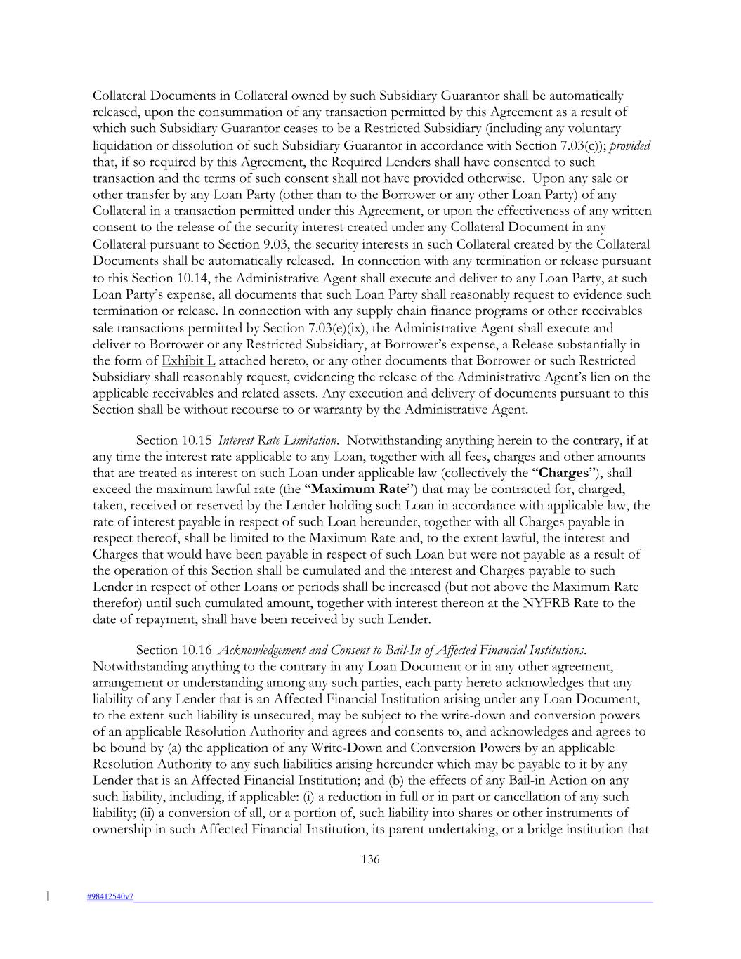 Collateral Documents in Collateral owned by such Subsidiary Guarantor shall be automatically released, upon the consummation of any transaction permitted by this Agreement as a result of which such Subsidiary Guarantor ceases to be a Restricted Subsidiary (including any voluntary liquidation or dissolution of such Subsidiary Guarantor in accordance with Section 7.03(c)); provided that, if so required by this Agreement, the Required Lenders shall have consented to such transaction and the terms of such consent shall not have provided otherwise. Upon any sale or other transfer by any Loan Party (other than to the Borrower or any other Loan Party) of any Collateral in a transaction permitted under this Agreement, or upon the effectiveness of any written consent to the release of the security interest created under any Collateral Document in any Collateral pursuant to Section 9.03, the security interests in such Collateral created by the Collateral Documents shall be automatically released. In connection with any termination or release pursuant to this Section 10.14, the Administrative Agent shall execute and deliver to any Loan Party, at such Loan Party’s expense, all documents that such Loan Party shall reasonably request to evidence such termination or release. In connection with any supply chain finance programs or other receivables sale transactions permitted by Section 7.03(e)(ix), the Administrative Agent shall execute and deliver to Borrower or any Restricted Subsidiary, at Borrower’s expense, a Release substantially in the form of Exhibit L attached hereto, or any other documents that Borrower or such Restricted Subsidiary shall reasonably request, evidencing the release of the Administrative Agent’s lien on the applicable receivables and related assets. Any execution and delivery of documents pursuant to this Section shall be without recourse to or warranty by the Administrative Agent. Section 10.15 Interest Rate Limitation. Notwithstanding anything herein to the contrary, if at any time the interest rate applicable to any Loan, together with all fees, charges and other amounts that are treated as interest on such Loan under applicable law (collectively the “Charges”), shall exceed the maximum lawful rate (the “Maximum Rate”) that may be contracted for, charged, taken, received or reserved by the Lender holding such Loan in accordance with applicable law, the rate of interest payable in respect of such Loan hereunder, together with all Charges payable in respect thereof, shall be limited to the Maximum Rate and, to the extent lawful, the interest and Charges that would have been payable in respect of such Loan but were not payable as a result of the operation of this Section shall be cumulated and the interest and Charges payable to such Lender in respect of other Loans or periods shall be increased (but not above the Maximum Rate therefor) until such cumulated amount, together with interest thereon at the NYFRB Rate to the date of repayment, shall have been received by such Lender. Section 10.16 Acknowledgement and Consent to Bail-In of Affected Financial Institutions. Notwithstanding anything to the contrary in any Loan Document or in any other agreement, arrangement or understanding among any such parties, each party hereto acknowledges that any liability of any Lender that is an Affected Financial Institution arising under any Loan Document, to the extent such liability is unsecured, may be subject to the write-down and conversion powers of an applicable Resolution Authority and agrees and consents to, and acknowledges and agrees to be bound by (a) the application of any Write-Down and Conversion Powers by an applicable Resolution Authority to any such liabilities arising hereunder which may be payable to it by any Lender that is an Affected Financial Institution; and (b) the effects of any Bail-in Action on any such liability, including, if applicable: (i) a reduction in full or in part or cancellation of any such liability; (ii) a conversion of all, or a portion of, such liability into shares or other instruments of ownership in such Affected Financial Institution, its parent undertaking, or a bridge institution that 136 #98412540v7