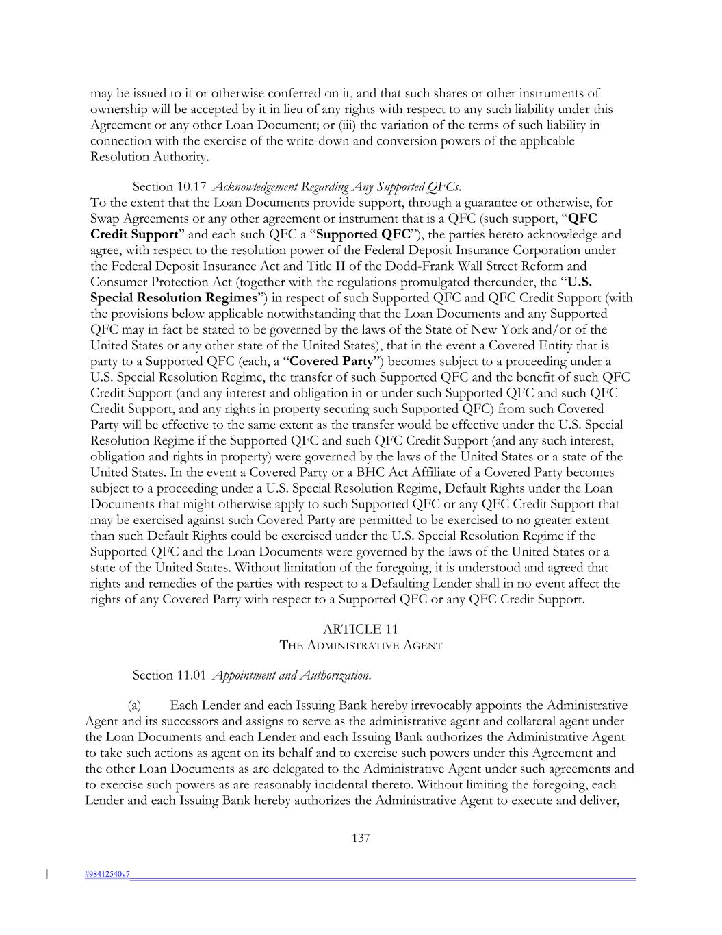 may be issued to it or otherwise conferred on it, and that such shares or other instruments of ownership will be accepted by it in lieu of any rights with respect to any such liability under this Agreement or any other Loan Document; or (iii) the variation of the terms of such liability in connection with the exercise of the write-down and conversion powers of the applicable Resolution Authority. Section 10.17 Acknowledgement Regarding Any Supported QFCs. To the extent that the Loan Documents provide support, through a guarantee or otherwise, for Swap Agreements or any other agreement or instrument that is a QFC (such support, “QFC Credit Support” and each such QFC a “Supported QFC”), the parties hereto acknowledge and agree, with respect to the resolution power of the Federal Deposit Insurance Corporation under the Federal Deposit Insurance Act and Title II of the Dodd-Frank Wall Street Reform and Consumer Protection Act (together with the regulations promulgated thereunder, the “U.S. Special Resolution Regimes”) in respect of such Supported QFC and QFC Credit Support (with the provisions below applicable notwithstanding that the Loan Documents and any Supported QFC may in fact be stated to be governed by the laws of the State of New York and/or of the United States or any other state of the United States), that in the event a Covered Entity that is party to a Supported QFC (each, a “Covered Party”) becomes subject to a proceeding under a U.S. Special Resolution Regime, the transfer of such Supported QFC and the benefit of such QFC Credit Support (and any interest and obligation in or under such Supported QFC and such QFC Credit Support, and any rights in property securing such Supported QFC) from such Covered Party will be effective to the same extent as the transfer would be effective under the U.S. Special Resolution Regime if the Supported QFC and such QFC Credit Support (and any such interest, obligation and rights in property) were governed by the laws of the United States or a state of the United States. In the event a Covered Party or a BHC Act Affiliate of a Covered Party becomes subject to a proceeding under a U.S. Special Resolution Regime, Default Rights under the Loan Documents that might otherwise apply to such Supported QFC or any QFC Credit Support that may be exercised against such Covered Party are permitted to be exercised to no greater extent than such Default Rights could be exercised under the U.S. Special Resolution Regime if the Supported QFC and the Loan Documents were governed by the laws of the United States or a state of the United States. Without limitation of the foregoing, it is understood and agreed that rights and remedies of the parties with respect to a Defaulting Lender shall in no event affect the rights of any Covered Party with respect to a Supported QFC or any QFC Credit Support. ARTICLE 11 THE ADMINISTRATIVE AGENT Section 11.01 Appointment and Authorization. (a) Each Lender and each Issuing Bank hereby irrevocably appoints the Administrative Agent and its successors and assigns to serve as the administrative agent and collateral agent under the Loan Documents and each Lender and each Issuing Bank authorizes the Administrative Agent to take such actions as agent on its behalf and to exercise such powers under this Agreement and the other Loan Documents as are delegated to the Administrative Agent under such agreements and to exercise such powers as are reasonably incidental thereto. Without limiting the foregoing, each Lender and each Issuing Bank hereby authorizes the Administrative Agent to execute and deliver, 137 #98412540v7