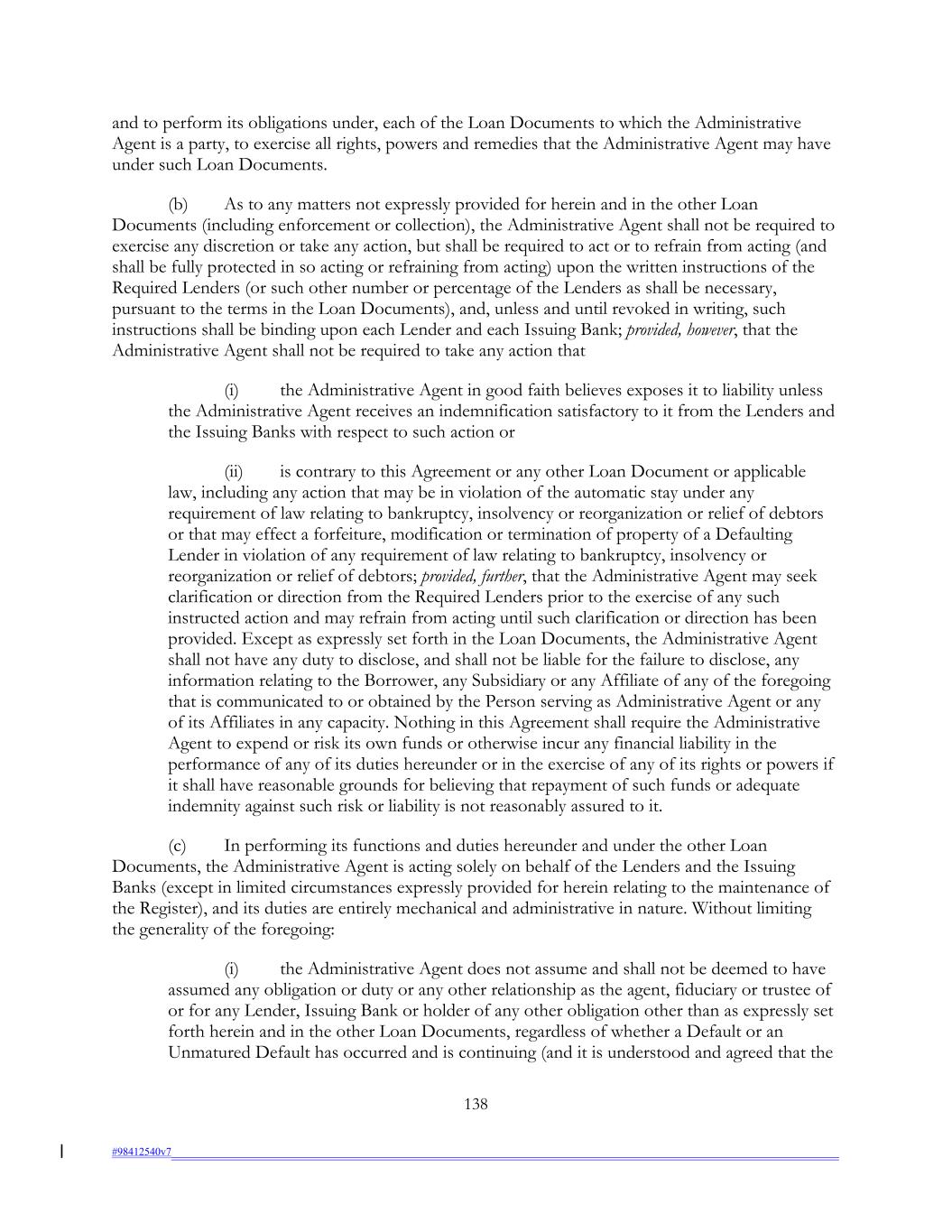and to perform its obligations under, each of the Loan Documents to which the Administrative Agent is a party, to exercise all rights, powers and remedies that the Administrative Agent may have under such Loan Documents. (b) As to any matters not expressly provided for herein and in the other Loan Documents (including enforcement or collection), the Administrative Agent shall not be required to exercise any discretion or take any action, but shall be required to act or to refrain from acting (and shall be fully protected in so acting or refraining from acting) upon the written instructions of the Required Lenders (or such other number or percentage of the Lenders as shall be necessary, pursuant to the terms in the Loan Documents), and, unless and until revoked in writing, such instructions shall be binding upon each Lender and each Issuing Bank; provided, however, that the Administrative Agent shall not be required to take any action that (i) the Administrative Agent in good faith believes exposes it to liability unless the Administrative Agent receives an indemnification satisfactory to it from the Lenders and the Issuing Banks with respect to such action or (ii) is contrary to this Agreement or any other Loan Document or applicable law, including any action that may be in violation of the automatic stay under any requirement of law relating to bankruptcy, insolvency or reorganization or relief of debtors or that may effect a forfeiture, modification or termination of property of a Defaulting Lender in violation of any requirement of law relating to bankruptcy, insolvency or reorganization or relief of debtors; provided, further, that the Administrative Agent may seek clarification or direction from the Required Lenders prior to the exercise of any such instructed action and may refrain from acting until such clarification or direction has been provided. Except as expressly set forth in the Loan Documents, the Administrative Agent shall not have any duty to disclose, and shall not be liable for the failure to disclose, any information relating to the Borrower, any Subsidiary or any Affiliate of any of the foregoing that is communicated to or obtained by the Person serving as Administrative Agent or any of its Affiliates in any capacity. Nothing in this Agreement shall require the Administrative Agent to expend or risk its own funds or otherwise incur any financial liability in the performance of any of its duties hereunder or in the exercise of any of its rights or powers if it shall have reasonable grounds for believing that repayment of such funds or adequate indemnity against such risk or liability is not reasonably assured to it. (c) In performing its functions and duties hereunder and under the other Loan Documents, the Administrative Agent is acting solely on behalf of the Lenders and the Issuing Banks (except in limited circumstances expressly provided for herein relating to the maintenance of the Register), and its duties are entirely mechanical and administrative in nature. Without limiting the generality of the foregoing: (i) the Administrative Agent does not assume and shall not be deemed to have assumed any obligation or duty or any other relationship as the agent, fiduciary or trustee of or for any Lender, Issuing Bank or holder of any other obligation other than as expressly set forth herein and in the other Loan Documents, regardless of whether a Default or an Unmatured Default has occurred and is continuing (and it is understood and agreed that the 138 #98412540v7