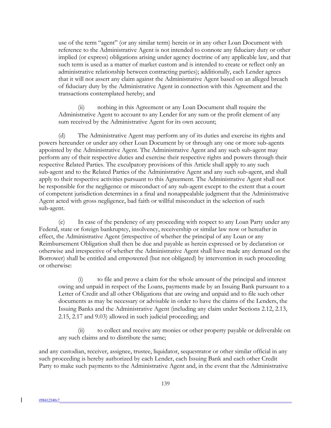 use of the term “agent” (or any similar term) herein or in any other Loan Document with reference to the Administrative Agent is not intended to connote any fiduciary duty or other implied (or express) obligations arising under agency doctrine of any applicable law, and that such term is used as a matter of market custom and is intended to create or reflect only an administrative relationship between contracting parties); additionally, each Lender agrees that it will not assert any claim against the Administrative Agent based on an alleged breach of fiduciary duty by the Administrative Agent in connection with this Agreement and the transactions contemplated hereby; and (ii) nothing in this Agreement or any Loan Document shall require the Administrative Agent to account to any Lender for any sum or the profit element of any sum received by the Administrative Agent for its own account; (d) The Administrative Agent may perform any of its duties and exercise its rights and powers hereunder or under any other Loan Document by or through any one or more sub-agents appointed by the Administrative Agent. The Administrative Agent and any such sub-agent may perform any of their respective duties and exercise their respective rights and powers through their respective Related Parties. The exculpatory provisions of this Article shall apply to any such sub-agent and to the Related Parties of the Administrative Agent and any such sub-agent, and shall apply to their respective activities pursuant to this Agreement. The Administrative Agent shall not be responsible for the negligence or misconduct of any sub-agent except to the extent that a court of competent jurisdiction determines in a final and nonappealable judgment that the Administrative Agent acted with gross negligence, bad faith or willful misconduct in the selection of such sub-agent. (e) In case of the pendency of any proceeding with respect to any Loan Party under any Federal, state or foreign bankruptcy, insolvency, receivership or similar law now or hereafter in effect, the Administrative Agent (irrespective of whether the principal of any Loan or any Reimbursement Obligation shall then be due and payable as herein expressed or by declaration or otherwise and irrespective of whether the Administrative Agent shall have made any demand on the Borrower) shall be entitled and empowered (but not obligated) by intervention in such proceeding or otherwise: (i) to file and prove a claim for the whole amount of the principal and interest owing and unpaid in respect of the Loans, payments made by an Issuing Bank pursuant to a Letter of Credit and all other Obligations that are owing and unpaid and to file such other documents as may be necessary or advisable in order to have the claims of the Lenders, the Issuing Banks and the Administrative Agent (including any claim under Sections 2.12, 2.13, 2.15, 2.17 and 9.03) allowed in such judicial proceeding; and (ii) to collect and receive any monies or other property payable or deliverable on any such claims and to distribute the same; and any custodian, receiver, assignee, trustee, liquidator, sequestrator or other similar official in any such proceeding is hereby authorized by each Lender, each Issuing Bank and each other Credit Party to make such payments to the Administrative Agent and, in the event that the Administrative 139 #98412540v7