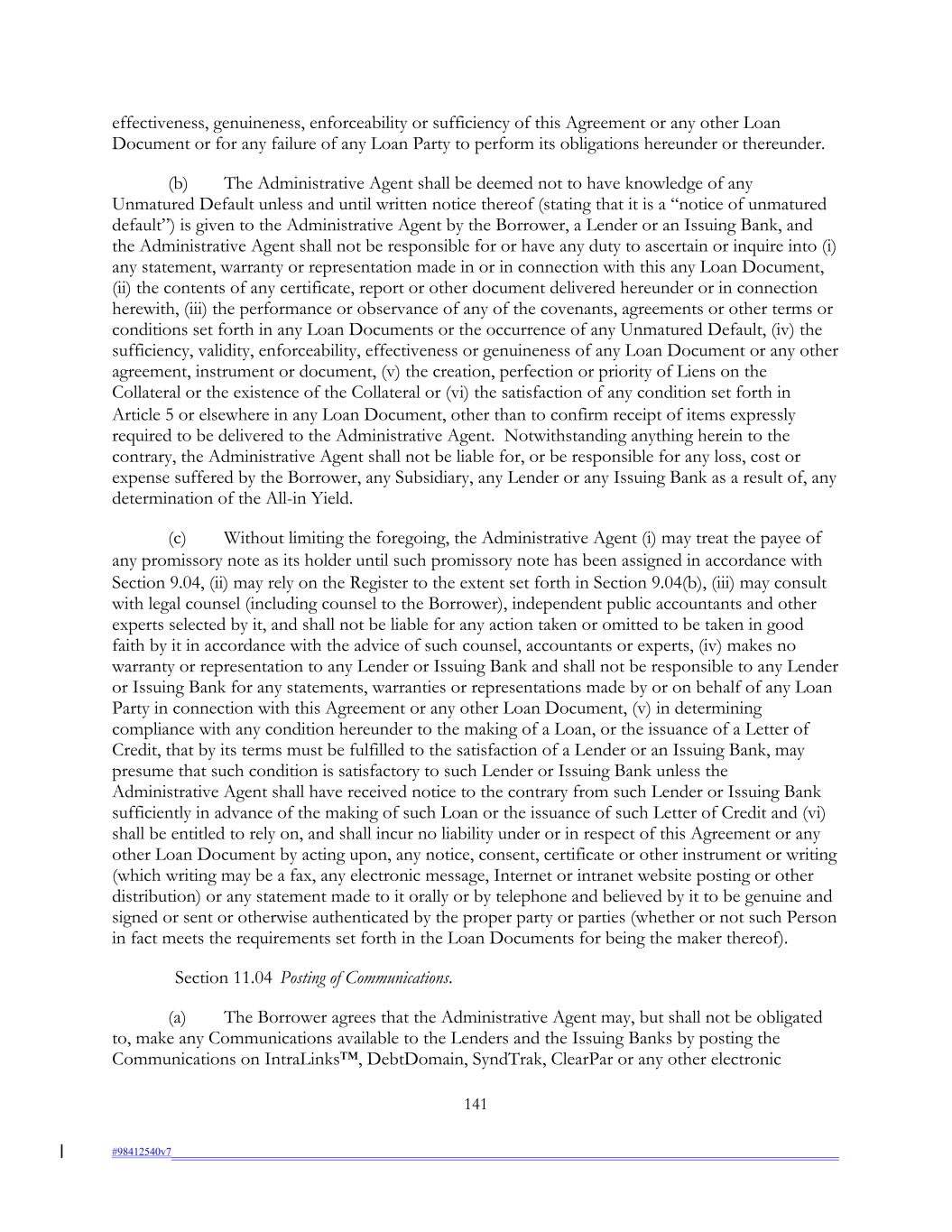effectiveness, genuineness, enforceability or sufficiency of this Agreement or any other Loan Document or for any failure of any Loan Party to perform its obligations hereunder or thereunder. (b) The Administrative Agent shall be deemed not to have knowledge of any Unmatured Default unless and until written notice thereof (stating that it is a “notice of unmatured default”) is given to the Administrative Agent by the Borrower, a Lender or an Issuing Bank, and the Administrative Agent shall not be responsible for or have any duty to ascertain or inquire into (i) any statement, warranty or representation made in or in connection with this any Loan Document, (ii) the contents of any certificate, report or other document delivered hereunder or in connection herewith, (iii) the performance or observance of any of the covenants, agreements or other terms or conditions set forth in any Loan Documents or the occurrence of any Unmatured Default, (iv) the sufficiency, validity, enforceability, effectiveness or genuineness of any Loan Document or any other agreement, instrument or document, (v) the creation, perfection or priority of Liens on the Collateral or the existence of the Collateral or (vi) the satisfaction of any condition set forth in Article 5 or elsewhere in any Loan Document, other than to confirm receipt of items expressly required to be delivered to the Administrative Agent. Notwithstanding anything herein to the contrary, the Administrative Agent shall not be liable for, or be responsible for any loss, cost or expense suffered by the Borrower, any Subsidiary, any Lender or any Issuing Bank as a result of, any determination of the All-in Yield. (c) Without limiting the foregoing, the Administrative Agent (i) may treat the payee of any promissory note as its holder until such promissory note has been assigned in accordance with Section 9.04, (ii) may rely on the Register to the extent set forth in Section 9.04(b), (iii) may consult with legal counsel (including counsel to the Borrower), independent public accountants and other experts selected by it, and shall not be liable for any action taken or omitted to be taken in good faith by it in accordance with the advice of such counsel, accountants or experts, (iv) makes no warranty or representation to any Lender or Issuing Bank and shall not be responsible to any Lender or Issuing Bank for any statements, warranties or representations made by or on behalf of any Loan Party in connection with this Agreement or any other Loan Document, (v) in determining compliance with any condition hereunder to the making of a Loan, or the issuance of a Letter of Credit, that by its terms must be fulfilled to the satisfaction of a Lender or an Issuing Bank, may presume that such condition is satisfactory to such Lender or Issuing Bank unless the Administrative Agent shall have received notice to the contrary from such Lender or Issuing Bank sufficiently in advance of the making of such Loan or the issuance of such Letter of Credit and (vi) shall be entitled to rely on, and shall incur no liability under or in respect of this Agreement or any other Loan Document by acting upon, any notice, consent, certificate or other instrument or writing (which writing may be a fax, any electronic message, Internet or intranet website posting or other distribution) or any statement made to it orally or by telephone and believed by it to be genuine and signed or sent or otherwise authenticated by the proper party or parties (whether or not such Person in fact meets the requirements set forth in the Loan Documents for being the maker thereof). Section 11.04 Posting of Communications. (a) The Borrower agrees that the Administrative Agent may, but shall not be obligated to, make any Communications available to the Lenders and the Issuing Banks by posting the Communications on IntraLinks™, DebtDomain, SyndTrak, ClearPar or any other electronic 141 #98412540v7