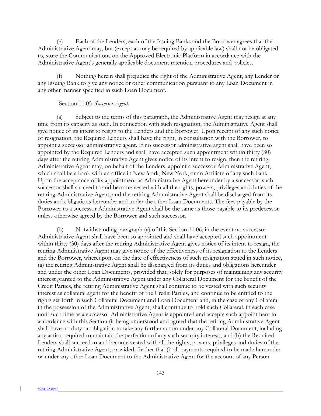 (e) Each of the Lenders, each of the Issuing Banks and the Borrower agrees that the Administrative Agent may, but (except as may be required by applicable law) shall not be obligated to, store the Communications on the Approved Electronic Platform in accordance with the Administrative Agent’s generally applicable document retention procedures and policies. (f) Nothing herein shall prejudice the right of the Administrative Agent, any Lender or any Issuing Bank to give any notice or other communication pursuant to any Loan Document in any other manner specified in such Loan Document. Section 11.05 Successor Agent. (a) Subject to the terms of this paragraph, the Administrative Agent may resign at any time from its capacity as such. In connection with such resignation, the Administrative Agent shall give notice of its intent to resign to the Lenders and the Borrower. Upon receipt of any such notice of resignation, the Required Lenders shall have the right, in consultation with the Borrower, to appoint a successor administrative agent. If no successor administrative agent shall have been so appointed by the Required Lenders and shall have accepted such appointment within thirty (30) days after the retiring Administrative Agent gives notice of its intent to resign, then the retiring Administrative Agent may, on behalf of the Lenders, appoint a successor Administrative Agent, which shall be a bank with an office in New York, New York, or an Affiliate of any such bank. Upon the acceptance of its appointment as Administrative Agent hereunder by a successor, such successor shall succeed to and become vested with all the rights, powers, privileges and duties of the retiring Administrative Agent, and the retiring Administrative Agent shall be discharged from its duties and obligations hereunder and under the other Loan Documents. The fees payable by the Borrower to a successor Administrative Agent shall be the same as those payable to its predecessor unless otherwise agreed by the Borrower and such successor. (b) Notwithstanding paragraph (a) of this Section 11.06, in the event no successor Administrative Agent shall have been so appointed and shall have accepted such appointment within thirty (30) days after the retiring Administrative Agent gives notice of its intent to resign, the retiring Administrative Agent may give notice of the effectiveness of its resignation to the Lenders and the Borrower, whereupon, on the date of effectiveness of such resignation stated in such notice, (a) the retiring Administrative Agent shall be discharged from its duties and obligations hereunder and under the other Loan Documents, provided that, solely for purposes of maintaining any security interest granted to the Administrative Agent under any Collateral Document for the benefit of the Credit Parties, the retiring Administrative Agent shall continue to be vested with such security interest as collateral agent for the benefit of the Credit Parties, and continue to be entitled to the rights set forth in such Collateral Document and Loan Document and, in the case of any Collateral in the possession of the Administrative Agent, shall continue to hold such Collateral, in each case until such time as a successor Administrative Agent is appointed and accepts such appointment in accordance with this Section (it being understood and agreed that the retiring Administrative Agent shall have no duty or obligation to take any further action under any Collateral Document, including any action required to maintain the perfection of any such security interest), and (b) the Required Lenders shall succeed to and become vested with all the rights, powers, privileges and duties of the retiring Administrative Agent, provided, further that (i) all payments required to be made hereunder or under any other Loan Document to the Administrative Agent for the account of any Person 143 #98412540v7