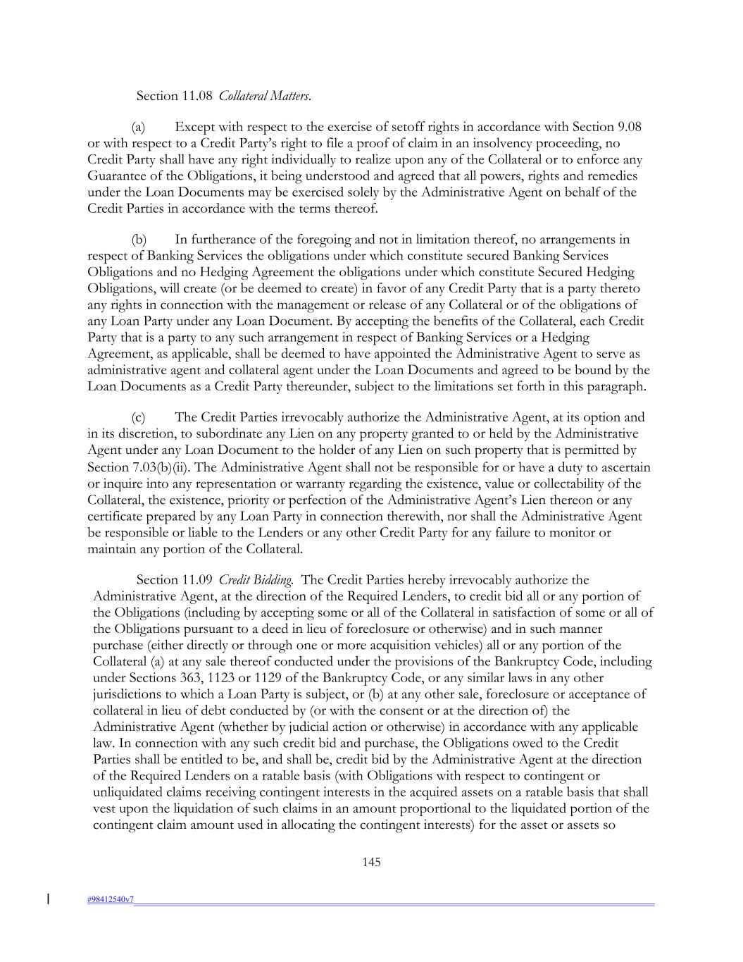 Section 11.08 Collateral Matters. (a) Except with respect to the exercise of setoff rights in accordance with Section 9.08 or with respect to a Credit Party’s right to file a proof of claim in an insolvency proceeding, no Credit Party shall have any right individually to realize upon any of the Collateral or to enforce any Guarantee of the Obligations, it being understood and agreed that all powers, rights and remedies under the Loan Documents may be exercised solely by the Administrative Agent on behalf of the Credit Parties in accordance with the terms thereof. (b) In furtherance of the foregoing and not in limitation thereof, no arrangements in respect of Banking Services the obligations under which constitute secured Banking Services Obligations and no Hedging Agreement the obligations under which constitute Secured Hedging Obligations, will create (or be deemed to create) in favor of any Credit Party that is a party thereto any rights in connection with the management or release of any Collateral or of the obligations of any Loan Party under any Loan Document. By accepting the benefits of the Collateral, each Credit Party that is a party to any such arrangement in respect of Banking Services or a Hedging Agreement, as applicable, shall be deemed to have appointed the Administrative Agent to serve as administrative agent and collateral agent under the Loan Documents and agreed to be bound by the Loan Documents as a Credit Party thereunder, subject to the limitations set forth in this paragraph. (c) The Credit Parties irrevocably authorize the Administrative Agent, at its option and in its discretion, to subordinate any Lien on any property granted to or held by the Administrative Agent under any Loan Document to the holder of any Lien on such property that is permitted by Section 7.03(b)(ii). The Administrative Agent shall not be responsible for or have a duty to ascertain or inquire into any representation or warranty regarding the existence, value or collectability of the Collateral, the existence, priority or perfection of the Administrative Agent’s Lien thereon or any certificate prepared by any Loan Party in connection therewith, nor shall the Administrative Agent be responsible or liable to the Lenders or any other Credit Party for any failure to monitor or maintain any portion of the Collateral. Section 11.09 Credit Bidding. The Credit Parties hereby irrevocably authorize the Administrative Agent, at the direction of the Required Lenders, to credit bid all or any portion of the Obligations (including by accepting some or all of the Collateral in satisfaction of some or all of the Obligations pursuant to a deed in lieu of foreclosure or otherwise) and in such manner purchase (either directly or through one or more acquisition vehicles) all or any portion of the Collateral (a) at any sale thereof conducted under the provisions of the Bankruptcy Code, including under Sections 363, 1123 or 1129 of the Bankruptcy Code, or any similar laws in any other jurisdictions to which a Loan Party is subject, or (b) at any other sale, foreclosure or acceptance of collateral in lieu of debt conducted by (or with the consent or at the direction of) the Administrative Agent (whether by judicial action or otherwise) in accordance with any applicable law. In connection with any such credit bid and purchase, the Obligations owed to the Credit Parties shall be entitled to be, and shall be, credit bid by the Administrative Agent at the direction of the Required Lenders on a ratable basis (with Obligations with respect to contingent or unliquidated claims receiving contingent interests in the acquired assets on a ratable basis that shall vest upon the liquidation of such claims in an amount proportional to the liquidated portion of the contingent claim amount used in allocating the contingent interests) for the asset or assets so 145 #98412540v7