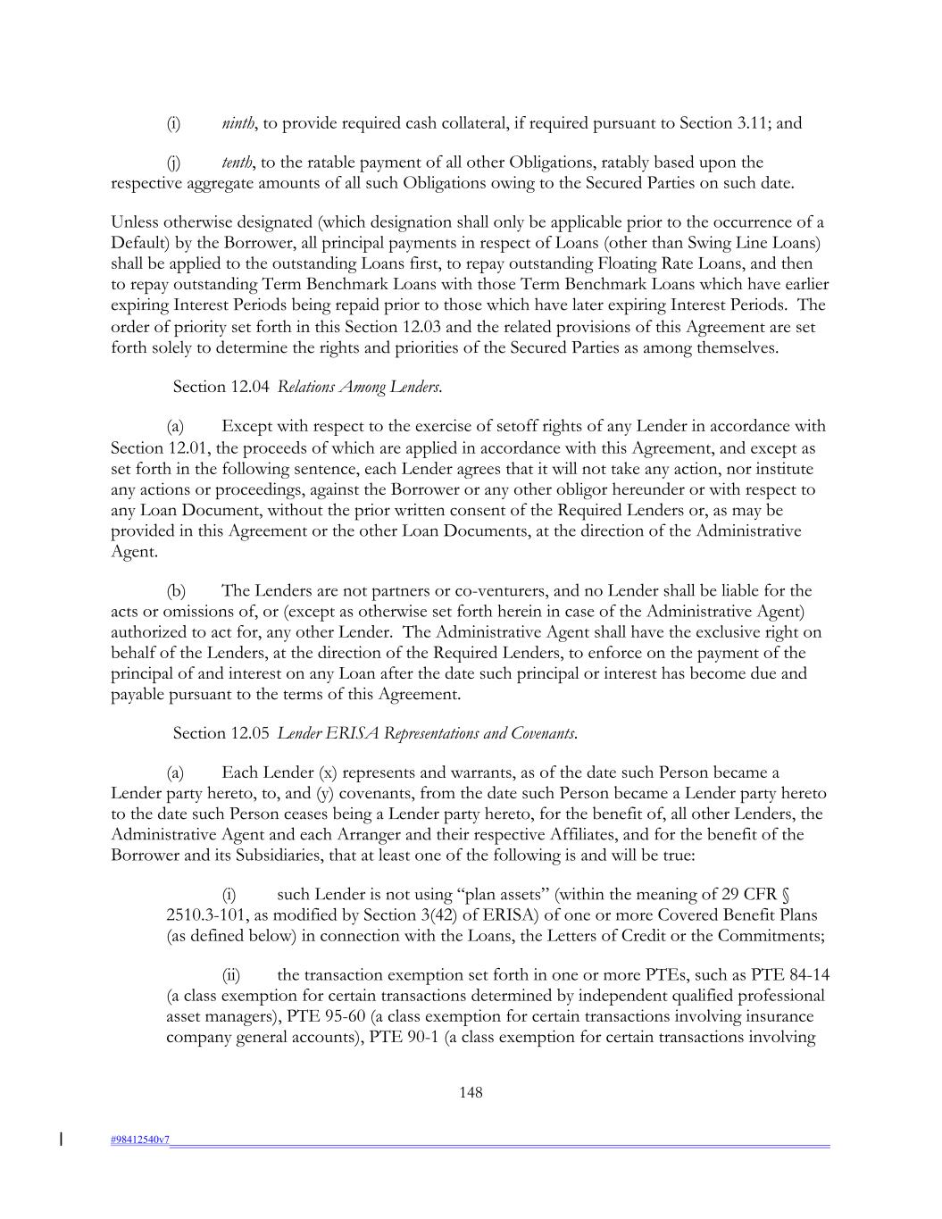 (i) ninth, to provide required cash collateral, if required pursuant to Section 3.11; and (j) tenth, to the ratable payment of all other Obligations, ratably based upon the respective aggregate amounts of all such Obligations owing to the Secured Parties on such date. Unless otherwise designated (which designation shall only be applicable prior to the occurrence of a Default) by the Borrower, all principal payments in respect of Loans (other than Swing Line Loans) shall be applied to the outstanding Loans first, to repay outstanding Floating Rate Loans, and then to repay outstanding Term Benchmark Loans with those Term Benchmark Loans which have earlier expiring Interest Periods being repaid prior to those which have later expiring Interest Periods. The order of priority set forth in this Section 12.03 and the related provisions of this Agreement are set forth solely to determine the rights and priorities of the Secured Parties as among themselves. Section 12.04 Relations Among Lenders. (a) Except with respect to the exercise of setoff rights of any Lender in accordance with Section 12.01, the proceeds of which are applied in accordance with this Agreement, and except as set forth in the following sentence, each Lender agrees that it will not take any action, nor institute any actions or proceedings, against the Borrower or any other obligor hereunder or with respect to any Loan Document, without the prior written consent of the Required Lenders or, as may be provided in this Agreement or the other Loan Documents, at the direction of the Administrative Agent. (b) The Lenders are not partners or co-venturers, and no Lender shall be liable for the acts or omissions of, or (except as otherwise set forth herein in case of the Administrative Agent) authorized to act for, any other Lender. The Administrative Agent shall have the exclusive right on behalf of the Lenders, at the direction of the Required Lenders, to enforce on the payment of the principal of and interest on any Loan after the date such principal or interest has become due and payable pursuant to the terms of this Agreement. Section 12.05 Lender ERISA Representations and Covenants. (a) Each Lender (x) represents and warrants, as of the date such Person became a Lender party hereto, to, and (y) covenants, from the date such Person became a Lender party hereto to the date such Person ceases being a Lender party hereto, for the benefit of, all other Lenders, the Administrative Agent and each Arranger and their respective Affiliates, and for the benefit of the Borrower and its Subsidiaries, that at least one of the following is and will be true: (i) such Lender is not using “plan assets” (within the meaning of 29 CFR § 2510.3-101, as modified by Section 3(42) of ERISA) of one or more Covered Benefit Plans (as defined below) in connection with the Loans, the Letters of Credit or the Commitments; (ii) the transaction exemption set forth in one or more PTEs, such as PTE 84-14 (a class exemption for certain transactions determined by independent qualified professional asset managers), PTE 95-60 (a class exemption for certain transactions involving insurance company general accounts), PTE 90-1 (a class exemption for certain transactions involving 148 #98412540v7