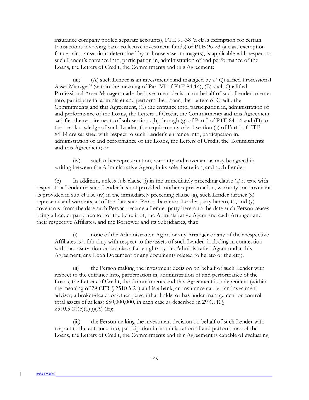 insurance company pooled separate accounts), PTE 91-38 (a class exemption for certain transactions involving bank collective investment funds) or PTE 96-23 (a class exemption for certain transactions determined by in-house asset managers), is applicable with respect to such Lender’s entrance into, participation in, administration of and performance of the Loans, the Letters of Credit, the Commitments and this Agreement; (iii) (A) such Lender is an investment fund managed by a “Qualified Professional Asset Manager” (within the meaning of Part VI of PTE 84-14), (B) such Qualified Professional Asset Manager made the investment decision on behalf of such Lender to enter into, participate in, administer and perform the Loans, the Letters of Credit, the Commitments and this Agreement, (C) the entrance into, participation in, administration of and performance of the Loans, the Letters of Credit, the Commitments and this Agreement satisfies the requirements of sub-sections (b) through (g) of Part I of PTE 84-14 and (D) to the best knowledge of such Lender, the requirements of subsection (a) of Part I of PTE 84-14 are satisfied with respect to such Lender’s entrance into, participation in, administration of and performance of the Loans, the Letters of Credit, the Commitments and this Agreement; or (iv) such other representation, warranty and covenant as may be agreed in writing between the Administrative Agent, in its sole discretion, and such Lender. (b) In addition, unless sub-clause (i) in the immediately preceding clause (a) is true with respect to a Lender or such Lender has not provided another representation, warranty and covenant as provided in sub-clause (iv) in the immediately preceding clause (a), such Lender further (x) represents and warrants, as of the date such Person became a Lender party hereto, to, and (y) covenants, from the date such Person became a Lender party hereto to the date such Person ceases being a Lender party hereto, for the benefit of, the Administrative Agent and each Arranger and their respective Affiliates, and the Borrower and its Subsidiaries, that: (i) none of the Administrative Agent or any Arranger or any of their respective Affiliates is a fiduciary with respect to the assets of such Lender (including in connection with the reservation or exercise of any rights by the Administrative Agent under this Agreement, any Loan Document or any documents related to hereto or thereto); (ii) the Person making the investment decision on behalf of such Lender with respect to the entrance into, participation in, administration of and performance of the Loans, the Letters of Credit, the Commitments and this Agreement is independent (within the meaning of 29 CFR § 2510.3-21) and is a bank, an insurance carrier, an investment adviser, a broker-dealer or other person that holds, or has under management or control, total assets of at least $50,000,000, in each case as described in 29 CFR § 2510.3-21(c)(1)(i)(A)-(E); (iii) the Person making the investment decision on behalf of such Lender with respect to the entrance into, participation in, administration of and performance of the Loans, the Letters of Credit, the Commitments and this Agreement is capable of evaluating 149 #98412540v7