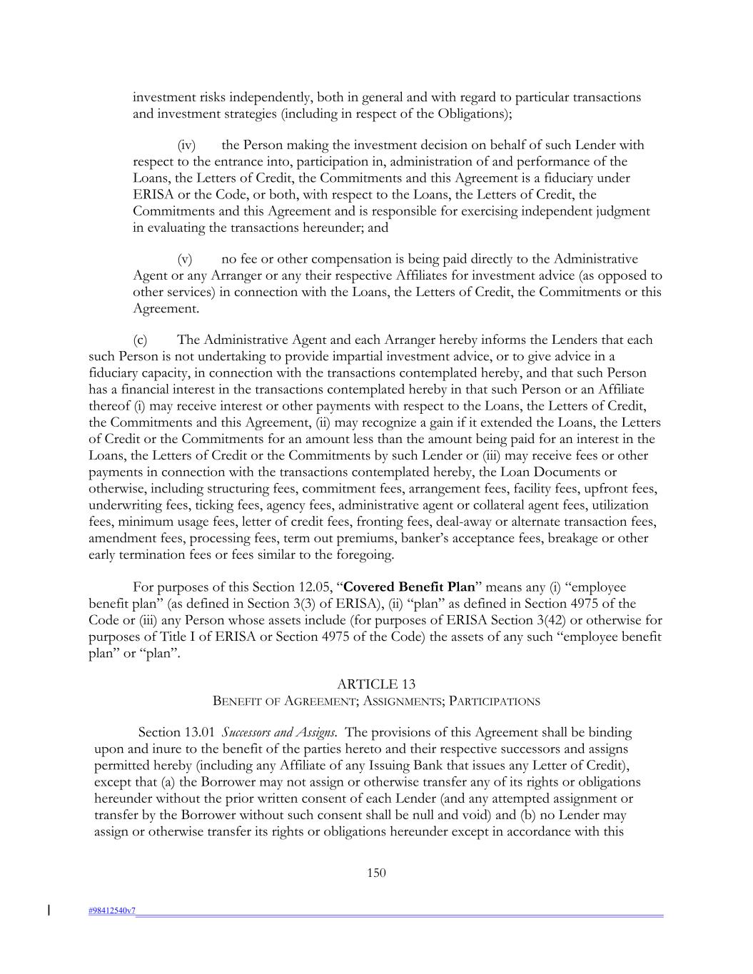 investment risks independently, both in general and with regard to particular transactions and investment strategies (including in respect of the Obligations); (iv) the Person making the investment decision on behalf of such Lender with respect to the entrance into, participation in, administration of and performance of the Loans, the Letters of Credit, the Commitments and this Agreement is a fiduciary under ERISA or the Code, or both, with respect to the Loans, the Letters of Credit, the Commitments and this Agreement and is responsible for exercising independent judgment in evaluating the transactions hereunder; and (v) no fee or other compensation is being paid directly to the Administrative Agent or any Arranger or any their respective Affiliates for investment advice (as opposed to other services) in connection with the Loans, the Letters of Credit, the Commitments or this Agreement. (c) The Administrative Agent and each Arranger hereby informs the Lenders that each such Person is not undertaking to provide impartial investment advice, or to give advice in a fiduciary capacity, in connection with the transactions contemplated hereby, and that such Person has a financial interest in the transactions contemplated hereby in that such Person or an Affiliate thereof (i) may receive interest or other payments with respect to the Loans, the Letters of Credit, the Commitments and this Agreement, (ii) may recognize a gain if it extended the Loans, the Letters of Credit or the Commitments for an amount less than the amount being paid for an interest in the Loans, the Letters of Credit or the Commitments by such Lender or (iii) may receive fees or other payments in connection with the transactions contemplated hereby, the Loan Documents or otherwise, including structuring fees, commitment fees, arrangement fees, facility fees, upfront fees, underwriting fees, ticking fees, agency fees, administrative agent or collateral agent fees, utilization fees, minimum usage fees, letter of credit fees, fronting fees, deal-away or alternate transaction fees, amendment fees, processing fees, term out premiums, banker’s acceptance fees, breakage or other early termination fees or fees similar to the foregoing. For purposes of this Section 12.05, “Covered Benefit Plan” means any (i) “employee benefit plan” (as defined in Section 3(3) of ERISA), (ii) “plan” as defined in Section 4975 of the Code or (iii) any Person whose assets include (for purposes of ERISA Section 3(42) or otherwise for purposes of Title I of ERISA or Section 4975 of the Code) the assets of any such “employee benefit plan” or “plan”. ARTICLE 13 BENEFIT OF AGREEMENT; ASSIGNMENTS; PARTICIPATIONS Section 13.01 Successors and Assigns. The provisions of this Agreement shall be binding upon and inure to the benefit of the parties hereto and their respective successors and assigns permitted hereby (including any Affiliate of any Issuing Bank that issues any Letter of Credit), except that (a) the Borrower may not assign or otherwise transfer any of its rights or obligations hereunder without the prior written consent of each Lender (and any attempted assignment or transfer by the Borrower without such consent shall be null and void) and (b) no Lender may assign or otherwise transfer its rights or obligations hereunder except in accordance with this 150 #98412540v7