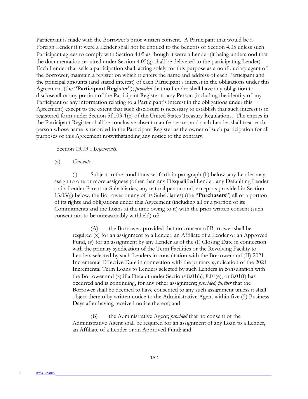 Participant is made with the Borrower’s prior written consent. A Participant that would be a Foreign Lender if it were a Lender shall not be entitled to the benefits of Section 4.05 unless such Participant agrees to comply with Section 4.05 as though it were a Lender (it being understood that the documentation required under Section 4.05(g) shall be delivered to the participating Lender). Each Lender that sells a participation shall, acting solely for this purpose as a nonfiduciary agent of the Borrower, maintain a register on which it enters the name and address of each Participant and the principal amounts (and stated interest) of each Participant’s interest in the obligations under this Agreement (the “Participant Register”); provided that no Lender shall have any obligation to disclose all or any portion of the Participant Register to any Person (including the identity of any Participant or any information relating to a Participant’s interest in the obligations under this Agreement) except to the extent that such disclosure is necessary to establish that such interest is in registered form under Section 5f.103-1(c) of the United States Treasury Regulations. The entries in the Participant Register shall be conclusive absent manifest error, and such Lender shall treat each person whose name is recorded in the Participant Register as the owner of such participation for all purposes of this Agreement notwithstanding any notice to the contrary. Section 13.03 Assignments. (a) Consents. (i) Subject to the conditions set forth in paragraph (b) below, any Lender may assign to one or more assignees (other than any Disqualified Lender, any Defaulting Lender or its Lender Parent or Subsidiaries, any natural person and, except as provided in Section 13.03(g) below, the Borrower or any of its Subsidiaries) (the “Purchasers”) all or a portion of its rights and obligations under this Agreement (including all or a portion of its Commitments and the Loans at the time owing to it) with the prior written consent (such consent not to be unreasonably withheld) of: (A) the Borrower; provided that no consent of Borrower shall be required (x) for an assignment to a Lender, an Affiliate of a Lender or an Approved Fund, (y) for an assignment by any Lender as of the (I) Closing Date in connection with the primary syndication of the Term Facilities or the Revolving Facility to Lenders selected by such Lenders in consultation with the Borrower and (II) 2021 Incremental Effective Date in connection with the primary syndication of the 2021 Incremental Term Loans to Lenders selected by such Lenders in consultation with the Borrower and (z) if a Default under Sections 8.01(a), 8.01(e), or 8.01(f) has occurred and is continuing, for any other assignment; provided, further that the Borrower shall be deemed to have consented to any such assignment unless it shall object thereto by written notice to the Administrative Agent within five (5) Business Days after having received notice thereof; and (B) the Administrative Agent; provided that no consent of the Administrative Agent shall be required for an assignment of any Loan to a Lender, an Affiliate of a Lender or an Approved Fund; and 152 #98412540v7