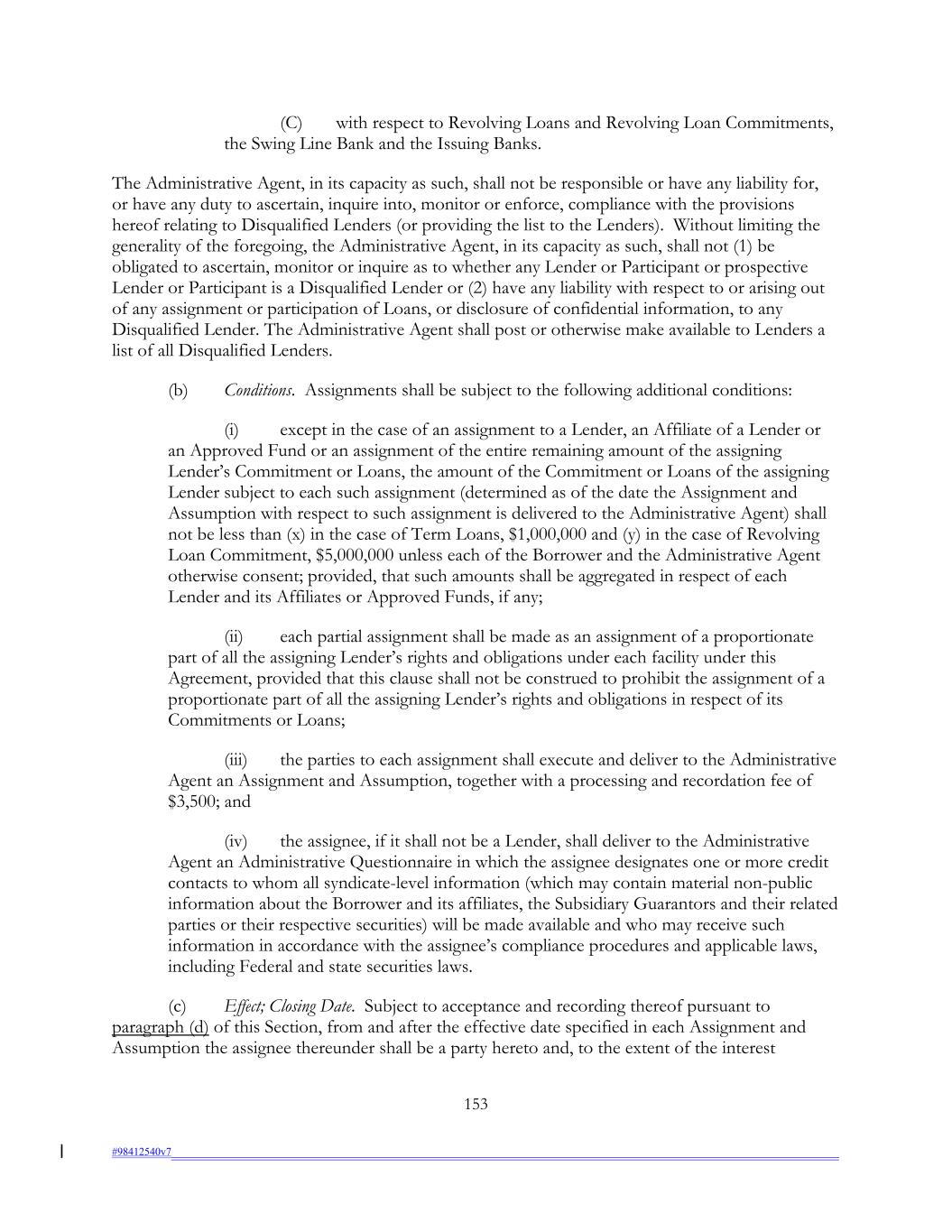 (C) with respect to Revolving Loans and Revolving Loan Commitments, the Swing Line Bank and the Issuing Banks. The Administrative Agent, in its capacity as such, shall not be responsible or have any liability for, or have any duty to ascertain, inquire into, monitor or enforce, compliance with the provisions hereof relating to Disqualified Lenders (or providing the list to the Lenders). Without limiting the generality of the foregoing, the Administrative Agent, in its capacity as such, shall not (1) be obligated to ascertain, monitor or inquire as to whether any Lender or Participant or prospective Lender or Participant is a Disqualified Lender or (2) have any liability with respect to or arising out of any assignment or participation of Loans, or disclosure of confidential information, to any Disqualified Lender. The Administrative Agent shall post or otherwise make available to Lenders a list of all Disqualified Lenders. (b) Conditions. Assignments shall be subject to the following additional conditions: (i) except in the case of an assignment to a Lender, an Affiliate of a Lender or an Approved Fund or an assignment of the entire remaining amount of the assigning Lender’s Commitment or Loans, the amount of the Commitment or Loans of the assigning Lender subject to each such assignment (determined as of the date the Assignment and Assumption with respect to such assignment is delivered to the Administrative Agent) shall not be less than (x) in the case of Term Loans, $1,000,000 and (y) in the case of Revolving Loan Commitment, $5,000,000 unless each of the Borrower and the Administrative Agent otherwise consent; provided, that such amounts shall be aggregated in respect of each Lender and its Affiliates or Approved Funds, if any; (ii) each partial assignment shall be made as an assignment of a proportionate part of all the assigning Lender’s rights and obligations under each facility under this Agreement, provided that this clause shall not be construed to prohibit the assignment of a proportionate part of all the assigning Lender’s rights and obligations in respect of its Commitments or Loans; (iii) the parties to each assignment shall execute and deliver to the Administrative Agent an Assignment and Assumption, together with a processing and recordation fee of $3,500; and (iv) the assignee, if it shall not be a Lender, shall deliver to the Administrative Agent an Administrative Questionnaire in which the assignee designates one or more credit contacts to whom all syndicate-level information (which may contain material non-public information about the Borrower and its affiliates, the Subsidiary Guarantors and their related parties or their respective securities) will be made available and who may receive such information in accordance with the assignee’s compliance procedures and applicable laws, including Federal and state securities laws. (c) Effect; Closing Date. Subject to acceptance and recording thereof pursuant to paragraph (d) of this Section, from and after the effective date specified in each Assignment and Assumption the assignee thereunder shall be a party hereto and, to the extent of the interest 153 #98412540v7