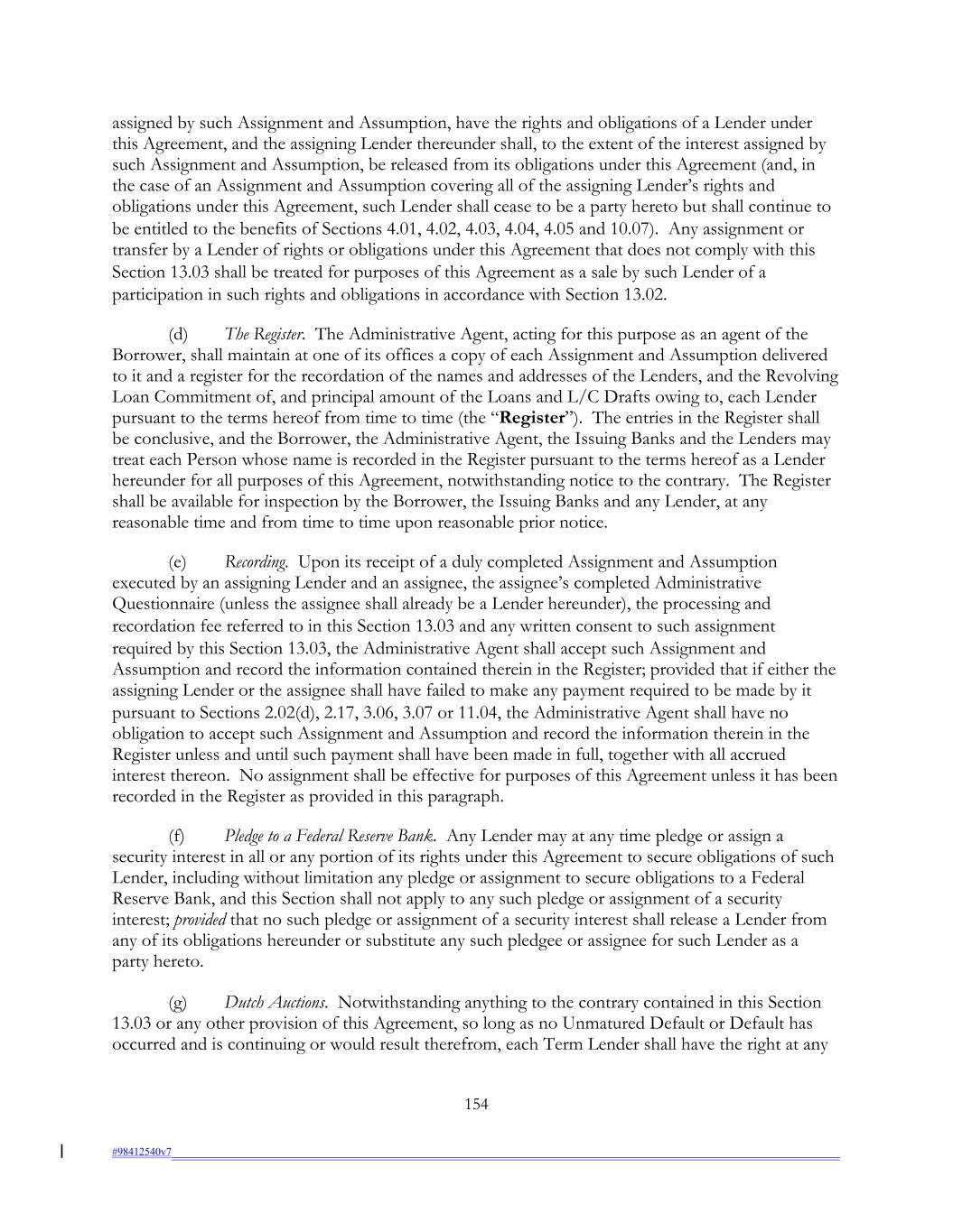 assigned by such Assignment and Assumption, have the rights and obligations of a Lender under this Agreement, and the assigning Lender thereunder shall, to the extent of the interest assigned by such Assignment and Assumption, be released from its obligations under this Agreement (and, in the case of an Assignment and Assumption covering all of the assigning Lender’s rights and obligations under this Agreement, such Lender shall cease to be a party hereto but shall continue to be entitled to the benefits of Sections 4.01, 4.02, 4.03, 4.04, 4.05 and 10.07). Any assignment or transfer by a Lender of rights or obligations under this Agreement that does not comply with this Section 13.03 shall be treated for purposes of this Agreement as a sale by such Lender of a participation in such rights and obligations in accordance with Section 13.02. (d) The Register. The Administrative Agent, acting for this purpose as an agent of the Borrower, shall maintain at one of its offices a copy of each Assignment and Assumption delivered to it and a register for the recordation of the names and addresses of the Lenders, and the Revolving Loan Commitment of, and principal amount of the Loans and L/C Drafts owing to, each Lender pursuant to the terms hereof from time to time (the “Register”). The entries in the Register shall be conclusive, and the Borrower, the Administrative Agent, the Issuing Banks and the Lenders may treat each Person whose name is recorded in the Register pursuant to the terms hereof as a Lender hereunder for all purposes of this Agreement, notwithstanding notice to the contrary. The Register shall be available for inspection by the Borrower, the Issuing Banks and any Lender, at any reasonable time and from time to time upon reasonable prior notice. (e) Recording. Upon its receipt of a duly completed Assignment and Assumption executed by an assigning Lender and an assignee, the assignee’s completed Administrative Questionnaire (unless the assignee shall already be a Lender hereunder), the processing and recordation fee referred to in this Section 13.03 and any written consent to such assignment required by this Section 13.03, the Administrative Agent shall accept such Assignment and Assumption and record the information contained therein in the Register; provided that if either the assigning Lender or the assignee shall have failed to make any payment required to be made by it pursuant to Sections 2.02(d), 2.17, 3.06, 3.07 or 11.04, the Administrative Agent shall have no obligation to accept such Assignment and Assumption and record the information therein in the Register unless and until such payment shall have been made in full, together with all accrued interest thereon. No assignment shall be effective for purposes of this Agreement unless it has been recorded in the Register as provided in this paragraph. (f) Pledge to a Federal Reserve Bank. Any Lender may at any time pledge or assign a security interest in all or any portion of its rights under this Agreement to secure obligations of such Lender, including without limitation any pledge or assignment to secure obligations to a Federal Reserve Bank, and this Section shall not apply to any such pledge or assignment of a security interest; provided that no such pledge or assignment of a security interest shall release a Lender from any of its obligations hereunder or substitute any such pledgee or assignee for such Lender as a party hereto. (g) Dutch Auctions. Notwithstanding anything to the contrary contained in this Section 13.03 or any other provision of this Agreement, so long as no Unmatured Default or Default has occurred and is continuing or would result therefrom, each Term Lender shall have the right at any 154 #98412540v7