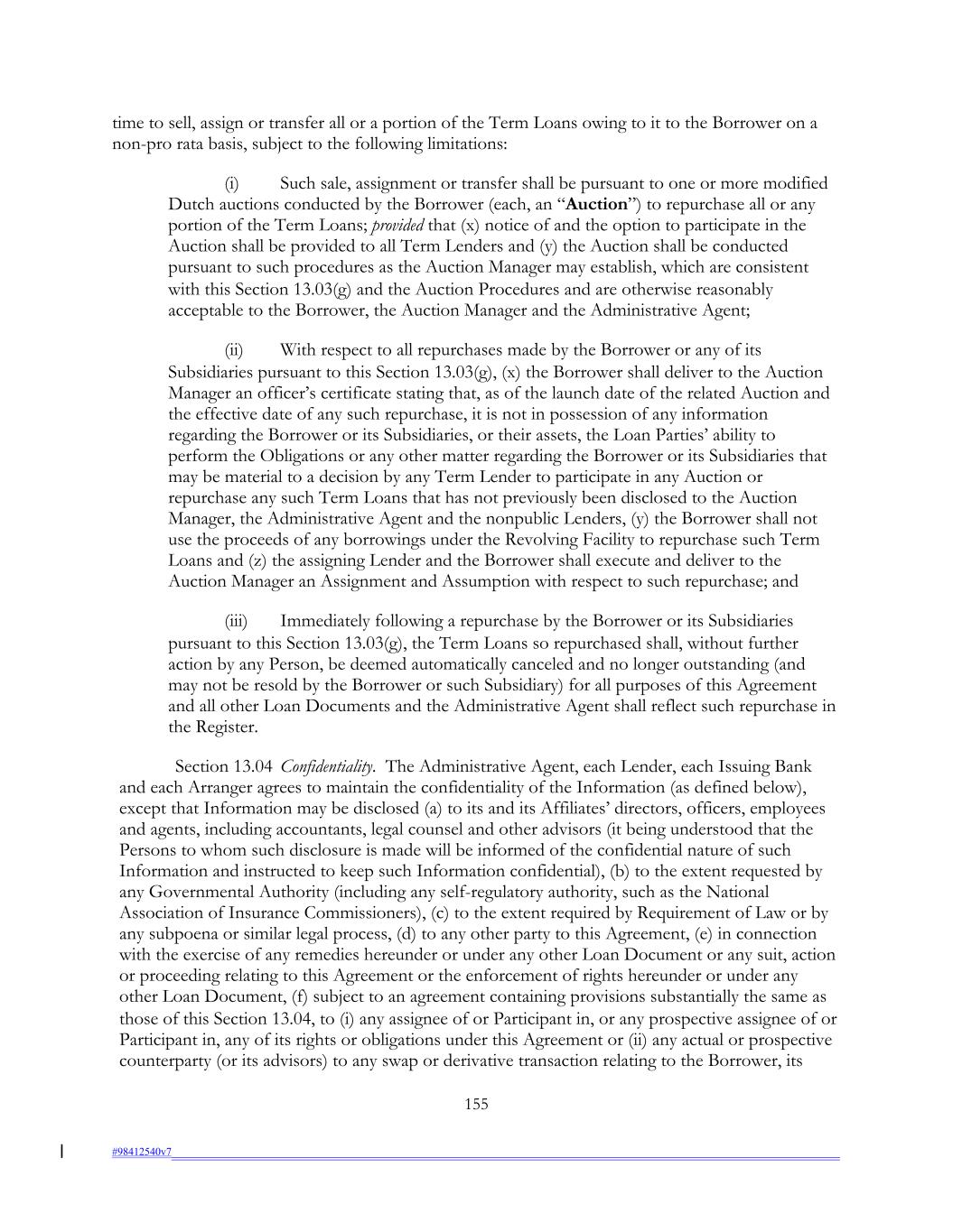 time to sell, assign or transfer all or a portion of the Term Loans owing to it to the Borrower on a non-pro rata basis, subject to the following limitations: (i) Such sale, assignment or transfer shall be pursuant to one or more modified Dutch auctions conducted by the Borrower (each, an “Auction”) to repurchase all or any portion of the Term Loans; provided that (x) notice of and the option to participate in the Auction shall be provided to all Term Lenders and (y) the Auction shall be conducted pursuant to such procedures as the Auction Manager may establish, which are consistent with this Section 13.03(g) and the Auction Procedures and are otherwise reasonably acceptable to the Borrower, the Auction Manager and the Administrative Agent; (ii) With respect to all repurchases made by the Borrower or any of its Subsidiaries pursuant to this Section 13.03(g), (x) the Borrower shall deliver to the Auction Manager an officer’s certificate stating that, as of the launch date of the related Auction and the effective date of any such repurchase, it is not in possession of any information regarding the Borrower or its Subsidiaries, or their assets, the Loan Parties’ ability to perform the Obligations or any other matter regarding the Borrower or its Subsidiaries that may be material to a decision by any Term Lender to participate in any Auction or repurchase any such Term Loans that has not previously been disclosed to the Auction Manager, the Administrative Agent and the nonpublic Lenders, (y) the Borrower shall not use the proceeds of any borrowings under the Revolving Facility to repurchase such Term Loans and (z) the assigning Lender and the Borrower shall execute and deliver to the Auction Manager an Assignment and Assumption with respect to such repurchase; and (iii) Immediately following a repurchase by the Borrower or its Subsidiaries pursuant to this Section 13.03(g), the Term Loans so repurchased shall, without further action by any Person, be deemed automatically canceled and no longer outstanding (and may not be resold by the Borrower or such Subsidiary) for all purposes of this Agreement and all other Loan Documents and the Administrative Agent shall reflect such repurchase in the Register. Section 13.04 Confidentiality. The Administrative Agent, each Lender, each Issuing Bank and each Arranger agrees to maintain the confidentiality of the Information (as defined below), except that Information may be disclosed (a) to its and its Affiliates’ directors, officers, employees and agents, including accountants, legal counsel and other advisors (it being understood that the Persons to whom such disclosure is made will be informed of the confidential nature of such Information and instructed to keep such Information confidential), (b) to the extent requested by any Governmental Authority (including any self-regulatory authority, such as the National Association of Insurance Commissioners), (c) to the extent required by Requirement of Law or by any subpoena or similar legal process, (d) to any other party to this Agreement, (e) in connection with the exercise of any remedies hereunder or under any other Loan Document or any suit, action or proceeding relating to this Agreement or the enforcement of rights hereunder or under any other Loan Document, (f) subject to an agreement containing provisions substantially the same as those of this Section 13.04, to (i) any assignee of or Participant in, or any prospective assignee of or Participant in, any of its rights or obligations under this Agreement or (ii) any actual or prospective counterparty (or its advisors) to any swap or derivative transaction relating to the Borrower, its 155 #98412540v7