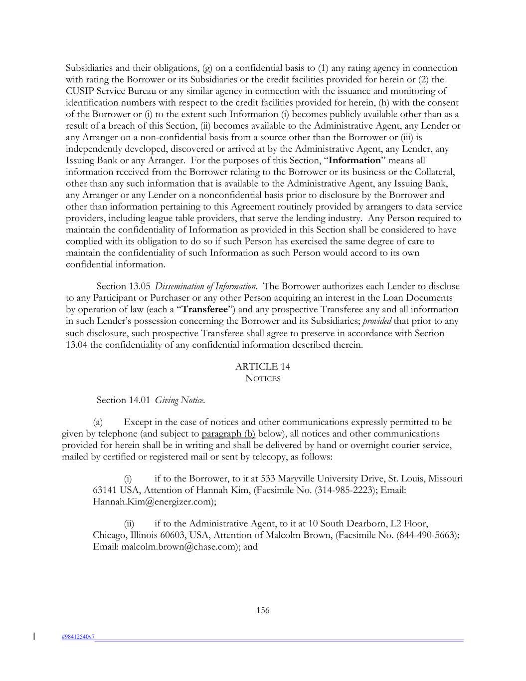 Subsidiaries and their obligations, (g) on a confidential basis to (1) any rating agency in connection with rating the Borrower or its Subsidiaries or the credit facilities provided for herein or (2) the CUSIP Service Bureau or any similar agency in connection with the issuance and monitoring of identification numbers with respect to the credit facilities provided for herein, (h) with the consent of the Borrower or (i) to the extent such Information (i) becomes publicly available other than as a result of a breach of this Section, (ii) becomes available to the Administrative Agent, any Lender or any Arranger on a non-confidential basis from a source other than the Borrower or (iii) is independently developed, discovered or arrived at by the Administrative Agent, any Lender, any Issuing Bank or any Arranger. For the purposes of this Section, “Information” means all information received from the Borrower relating to the Borrower or its business or the Collateral, other than any such information that is available to the Administrative Agent, any Issuing Bank, any Arranger or any Lender on a nonconfidential basis prior to disclosure by the Borrower and other than information pertaining to this Agreement routinely provided by arrangers to data service providers, including league table providers, that serve the lending industry. Any Person required to maintain the confidentiality of Information as provided in this Section shall be considered to have complied with its obligation to do so if such Person has exercised the same degree of care to maintain the confidentiality of such Information as such Person would accord to its own confidential information. Section 13.05 Dissemination of Information. The Borrower authorizes each Lender to disclose to any Participant or Purchaser or any other Person acquiring an interest in the Loan Documents by operation of law (each a “Transferee”) and any prospective Transferee any and all information in such Lender’s possession concerning the Borrower and its Subsidiaries; provided that prior to any such disclosure, such prospective Transferee shall agree to preserve in accordance with Section 13.04 the confidentiality of any confidential information described therein. ARTICLE 14 NOTICES Section 14.01 Giving Notice. (a) Except in the case of notices and other communications expressly permitted to be given by telephone (and subject to paragraph (b) below), all notices and other communications provided for herein shall be in writing and shall be delivered by hand or overnight courier service, mailed by certified or registered mail or sent by telecopy, as follows: (i) if to the Borrower, to it at 533 Maryville University Drive, St. Louis, Missouri 63141 USA, Attention of Hannah Kim, (Facsimile No. (314-985-2223); Email: Hannah.Kim@energizer.com); (ii) if to the Administrative Agent, to it at 10 South Dearborn, L2 Floor, Chicago, Illinois 60603, USA, Attention of Malcolm Brown, (Facsimile No. (844-490-5663); Email: malcolm.brown@chase.com); and 156 #98412540v7
