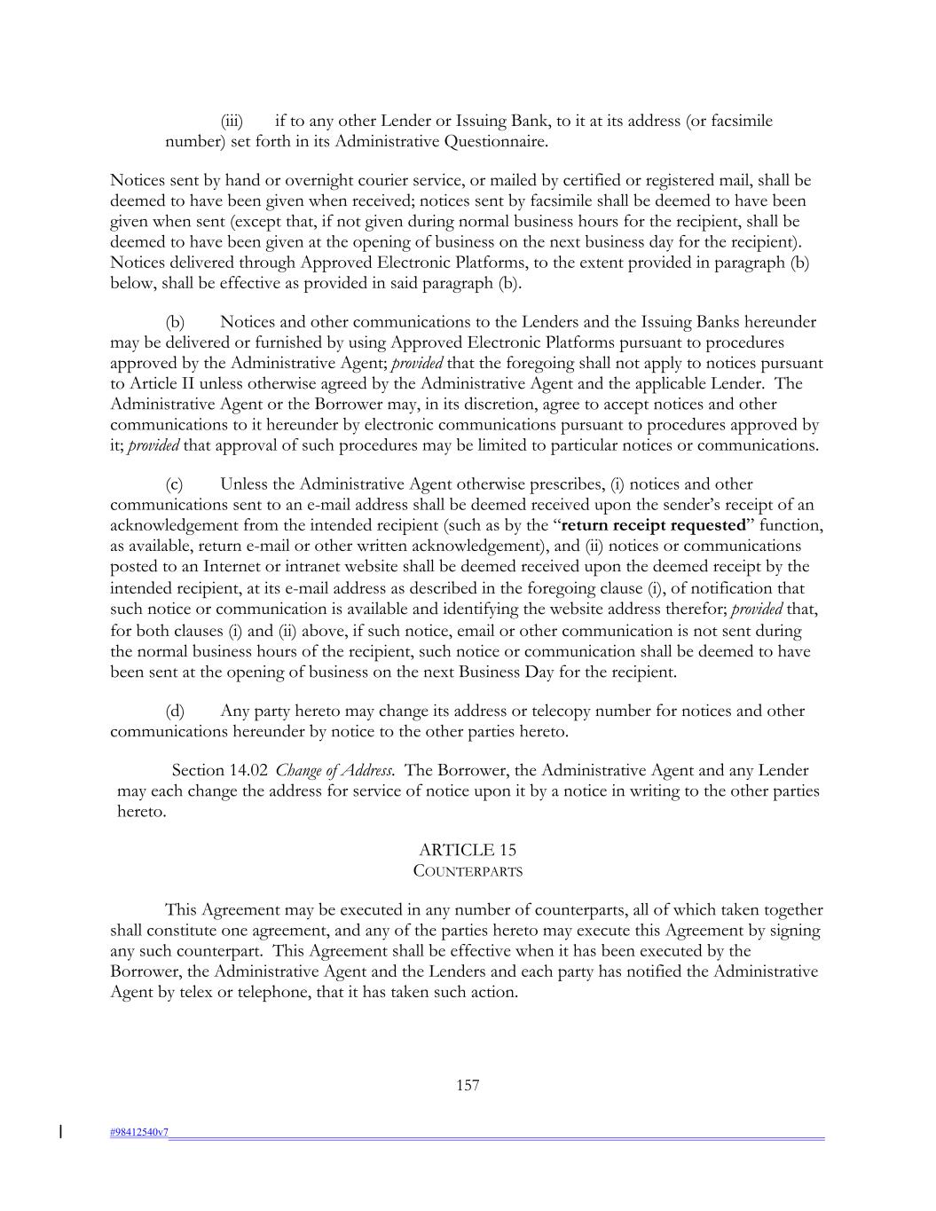 (iii) if to any other Lender or Issuing Bank, to it at its address (or facsimile number) set forth in its Administrative Questionnaire. Notices sent by hand or overnight courier service, or mailed by certified or registered mail, shall be deemed to have been given when received; notices sent by facsimile shall be deemed to have been given when sent (except that, if not given during normal business hours for the recipient, shall be deemed to have been given at the opening of business on the next business day for the recipient). Notices delivered through Approved Electronic Platforms, to the extent provided in paragraph (b) below, shall be effective as provided in said paragraph (b). (b) Notices and other communications to the Lenders and the Issuing Banks hereunder may be delivered or furnished by using Approved Electronic Platforms pursuant to procedures approved by the Administrative Agent; provided that the foregoing shall not apply to notices pursuant to Article II unless otherwise agreed by the Administrative Agent and the applicable Lender. The Administrative Agent or the Borrower may, in its discretion, agree to accept notices and other communications to it hereunder by electronic communications pursuant to procedures approved by it; provided that approval of such procedures may be limited to particular notices or communications. (c) Unless the Administrative Agent otherwise prescribes, (i) notices and other communications sent to an e-mail address shall be deemed received upon the sender’s receipt of an acknowledgement from the intended recipient (such as by the “return receipt requested” function, as available, return e-mail or other written acknowledgement), and (ii) notices or communications posted to an Internet or intranet website shall be deemed received upon the deemed receipt by the intended recipient, at its e-mail address as described in the foregoing clause (i), of notification that such notice or communication is available and identifying the website address therefor; provided that, for both clauses (i) and (ii) above, if such notice, email or other communication is not sent during the normal business hours of the recipient, such notice or communication shall be deemed to have been sent at the opening of business on the next Business Day for the recipient. (d) Any party hereto may change its address or telecopy number for notices and other communications hereunder by notice to the other parties hereto. Section 14.02 Change of Address. The Borrower, the Administrative Agent and any Lender may each change the address for service of notice upon it by a notice in writing to the other parties hereto. ARTICLE 15 COUNTERPARTS This Agreement may be executed in any number of counterparts, all of which taken together shall constitute one agreement, and any of the parties hereto may execute this Agreement by signing any such counterpart. This Agreement shall be effective when it has been executed by the Borrower, the Administrative Agent and the Lenders and each party has notified the Administrative Agent by telex or telephone, that it has taken such action. 157 #98412540v7