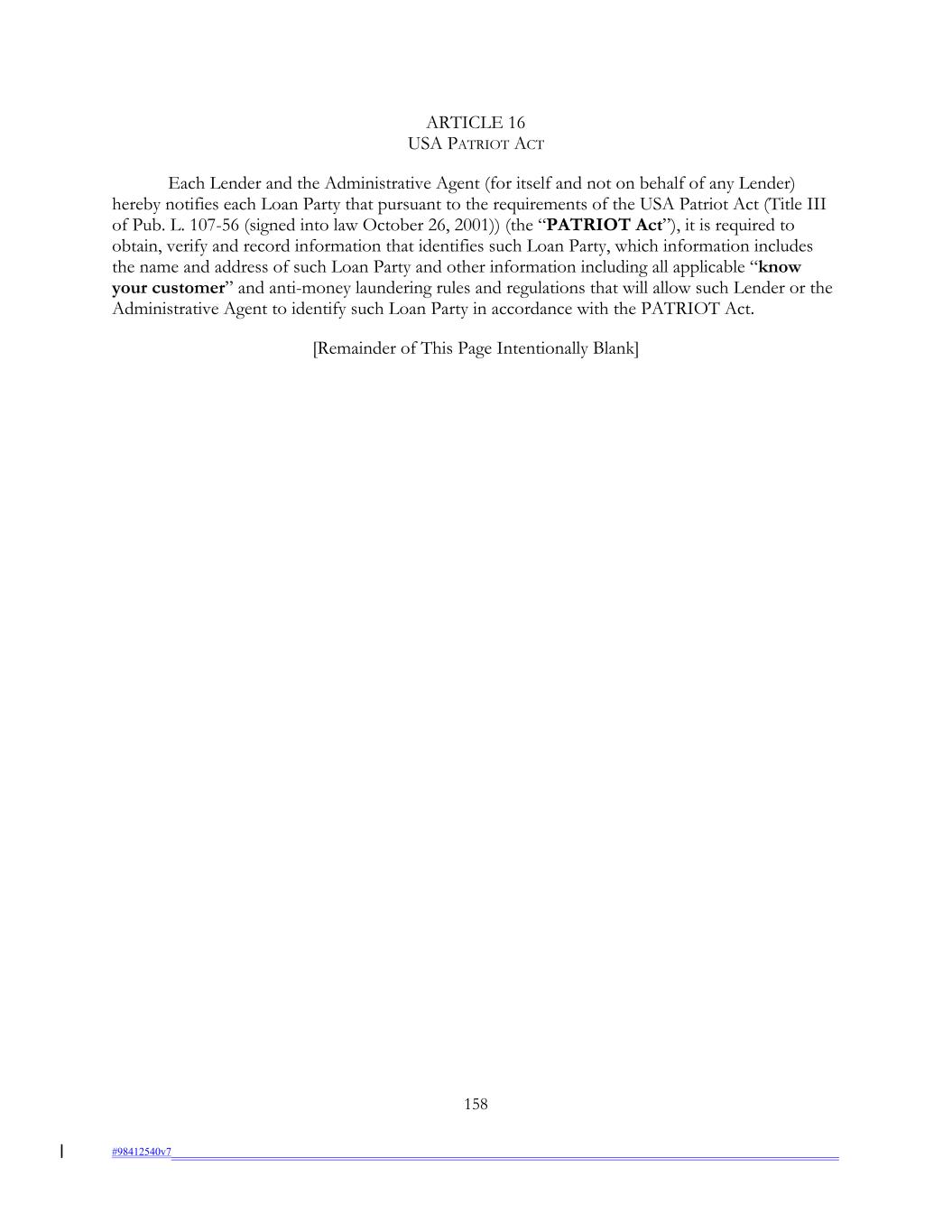 ARTICLE 16 USA PATRIOT ACT Each Lender and the Administrative Agent (for itself and not on behalf of any Lender) hereby notifies each Loan Party that pursuant to the requirements of the USA Patriot Act (Title III of Pub. L. 107-56 (signed into law October 26, 2001)) (the “PATRIOT Act”), it is required to obtain, verify and record information that identifies such Loan Party, which information includes the name and address of such Loan Party and other information including all applicable “know your customer” and anti-money laundering rules and regulations that will allow such Lender or the Administrative Agent to identify such Loan Party in accordance with the PATRIOT Act. [Remainder of This Page Intentionally Blank] 158 #98412540v7