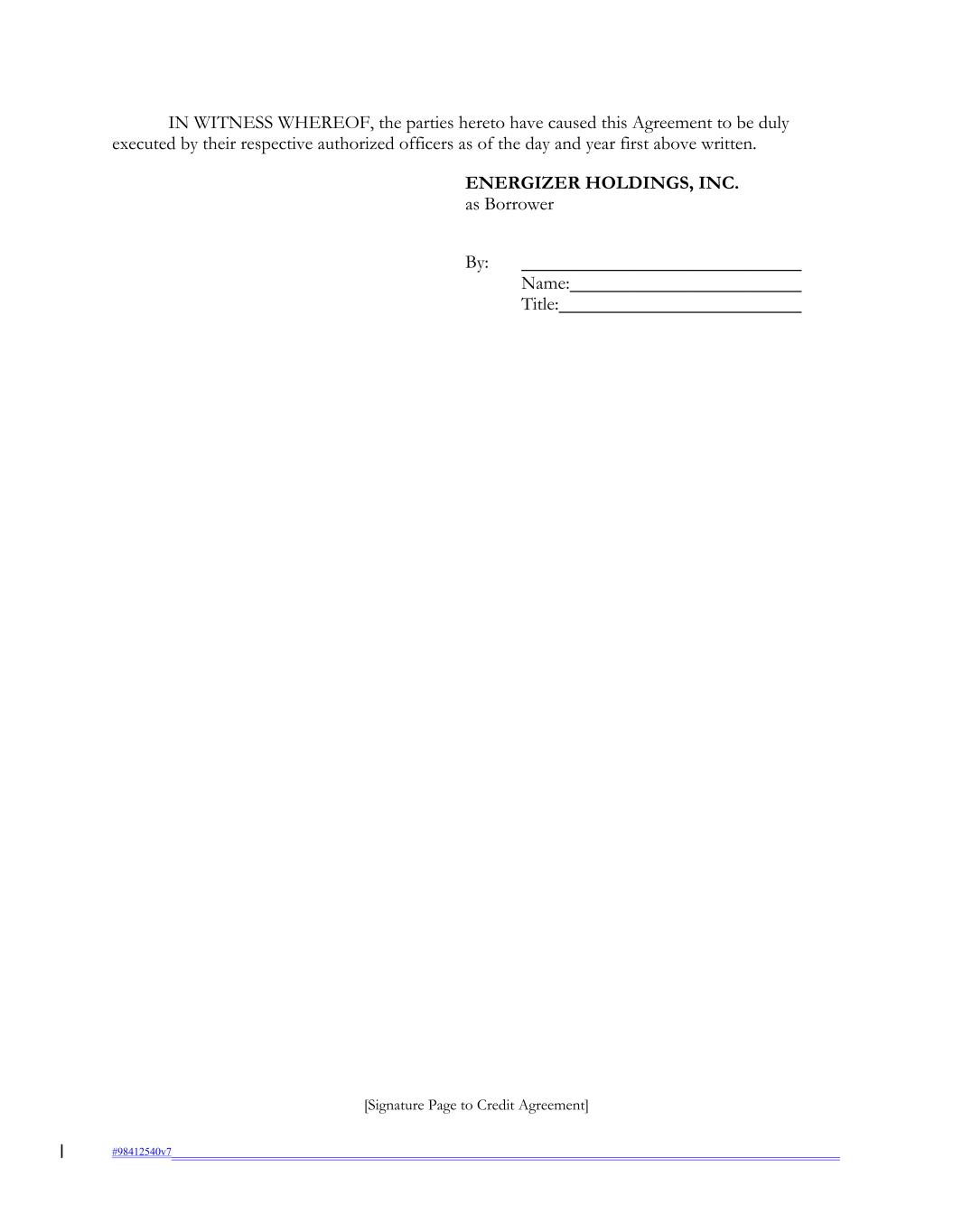 [Signature Page to Credit Agreement] #98412540v7 IN WITNESS WHEREOF, the parties hereto have caused this Agreement to be duly executed by their respective authorized officers as of the day and year first above written. By: Name: Title: ENERGIZER HOLDINGS, INC. as Borrower