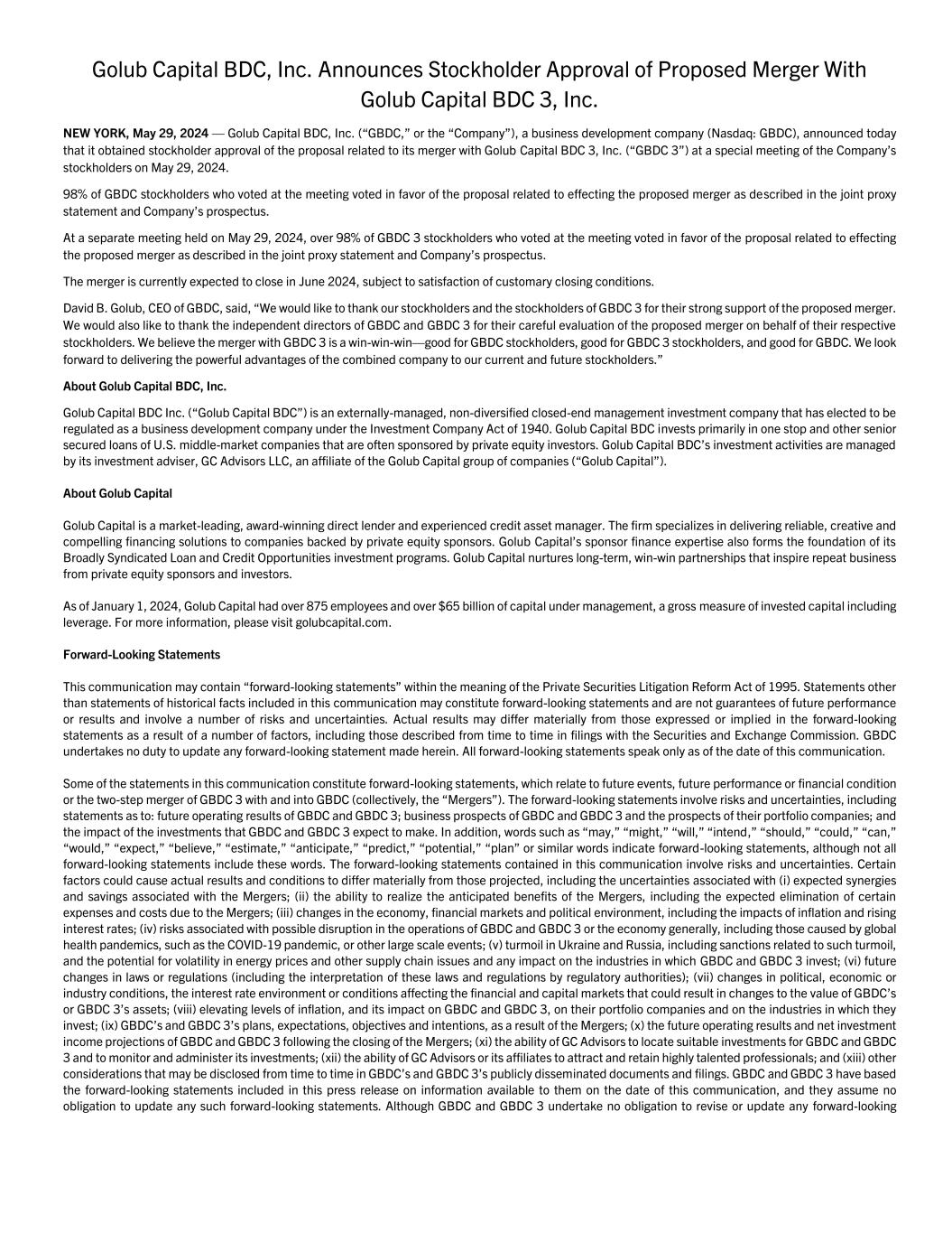 •Proposal No. 1 – To approve the issuance of shares of GBDC Common Stock, pursuant to the Agreement and Plan of Merger dated as of January 16, 2024 (as amended, the “Merger Agreement”) by and among the Company, Park Avenue Subsidiary Inc., a wholly owned subsidiary of the Company, Golub Capital BDC 3, Inc., a Maryland corporation (“GBDC 3”), GC Advisors LLC (“GC Advisors”), and, for certain limited purposes, Golub Capital LLC.