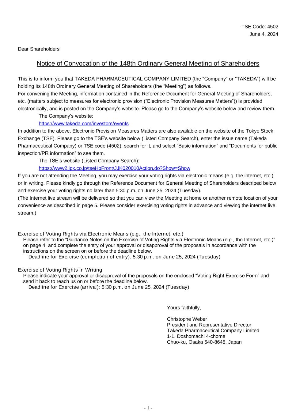 - 1 - TSE Code: 4502 June 4, 2024 Dear Shareholders Notice of Convocation of the 148th Ordinary General Meeting of Shareholders This is to inform you that TAKEDA PHARMACEUTICAL COMPANY LIMITED (the “Company” or “TAKEDA”) will be holding its 148th Ordinary General Meeting of Shareholders (the “Meeting”) as follows. For convening the Meeting, information contained in the Reference Document for General Meeting of Shareholders, etc. (matters subject to measures for electronic provision (“Electronic Provision Measures Matters”)) is provided electronically, and is posted on the Company’s website. Please go to the Company’s website below and review them. The Company’s website: https://www.takeda.com/investors/events In addition to the above, Electronic Provision Measures Matters are also available on the website of the Tokyo Stock Exchange (TSE). Please go to the TSE’s website below (Listed Company Search), enter the issue name (Takeda Pharmaceutical Company) or TSE code (4502), search for it, and select “Basic information” and “Documents for public inspection/PR information” to see them. The TSE’s website (Listed Company Search): https://www2.jpx.co.jp/tseHpFront/JJK020010Action.do?Show=Show If you are not attending the Meeting, you may exercise your voting rights via electronic means (e.g. the internet, etc.) or in writing. Please kindly go through the Reference Document for General Meeting of Shareholders described below and exercise your voting rights no later than 5:30 p.m. on June 25, 2024 (Tuesday). (The Internet live stream will be delivered so that you can view the Meeting at home or another remote location of your convenience as described in page 5. Please consider exercising voting rights in advance and viewing the internet live stream.) Exercise of Voting Rights via Electronic Means (e.g.: the Internet, etc.) Please refer to the “Guidance Notes on the Exercise of Voting Rights via Electronic Means (e.g., the Internet, etc.)” on page 4, and complete the entry of your approval or disapproval of the proposals in accordance with the instructions on the screen on or before the deadline below. Deadline for Exercise (completion of entry): 5:30 p.m. on June 25, 2024 (Tuesday) Exercise of Voting Rights in Writing Please indicate your approval or disapproval of the proposals on the enclosed “Voting Right Exercise Form” and send it back to reach us on or before the deadline below. Deadline for Exercise (arrival): 5:30 p.m. on June 25, 2024 (Tuesday) Yours faithfully, Christophe Weber President and Representative Director Takeda Pharmaceutical Company Limited 1-1, Doshomachi 4-chome Chuo-ku, Osaka 540-8645, Japan