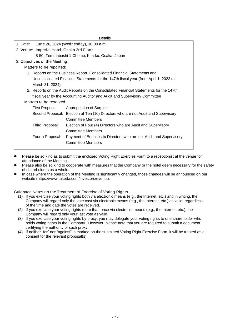 - 2 - Details 1. Date: June 26, 2024 (Wednesday), 10:00 a.m. 2. Venue: Imperial Hotel, Osaka 3rd Floor 8-50, Temmabashi 1-Chome, Kita-ku, Osaka, Japan 3. Objectives of the Meeting: Matters to be reported: 1. Reports on the Business Report, Consolidated Financial Statements and Unconsolidated Financial Statements for the 147th fiscal year (from April 1, 2023 to March 31, 2024) 2. Reports on the Audit Reports on the Consolidated Financial Statements for the 147th fiscal year by the Accounting Auditor and Audit and Supervisory Committee Matters to be resolved: First Proposal: Appropriation of Surplus Second Proposal: Election of Ten (10) Directors who are not Audit and Supervisory Committee Members Third Proposal: Election of Four (4) Directors who are Audit and Supervisory Committee Members Fourth Proposal: Payment of Bonuses to Directors who are not Audit and Supervisory Committee Members ⚫ Please be so kind as to submit the enclosed Voting Right Exercise Form to a receptionist at the venue for attendance of the Meeting. ⚫ Please also be so kind to cooperate with measures that the Company or the hotel deem necessary for the safety of shareholders as a whole. ⚫ In case where the operation of the Meeting is significantly changed, those changes will be announced on our website (https://www.takeda.com/investors/events). Guidance Notes on the Treatment of Exercise of Voting Rights (1) If you exercise your voting rights both via electronic means (e.g., the Internet, etc.) and in writing, the Company will regard only the vote cast via electronic means (e.g., the Internet, etc.) as valid, regardless of the time and date the votes are received. (2) If you exercise your voting rights more than once via electronic means (e.g., the Internet, etc.), the Company will regard only your last vote as valid. (3) If you exercise your voting rights by proxy, you may delegate your voting rights to one shareholder who holds voting rights in the Company. However, please note that you are required to submit a document certifying the authority of such proxy. (4) If neither “for” nor “against” is marked on the submitted Voting Right Exercise Form, it will be treated as a consent for the relevant proposal(s).