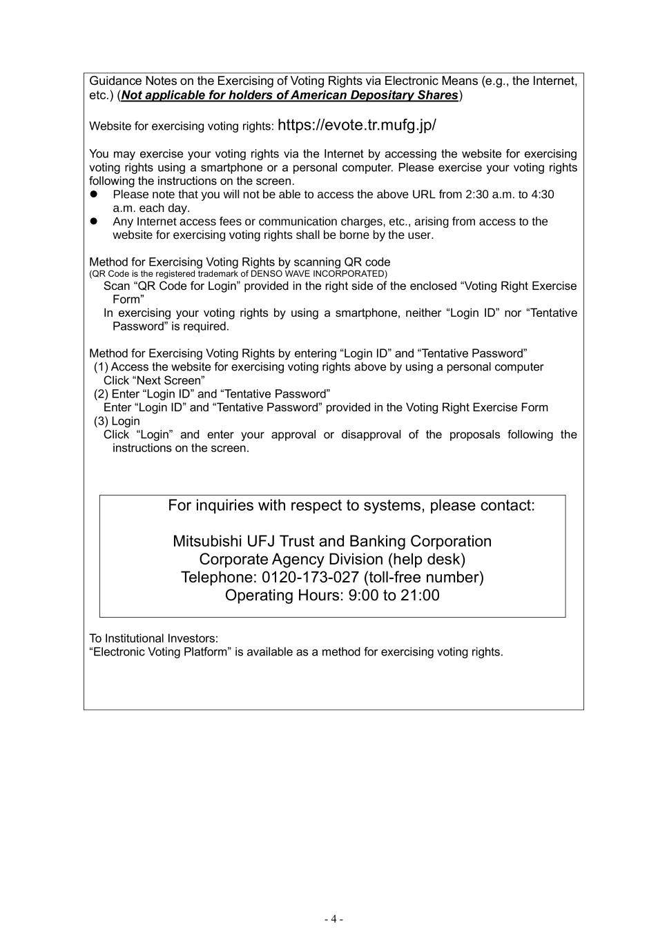 - 4 - Guidance Notes on the Exercising of Voting Rights via Electronic Means (e.g., the Internet, etc.) (Not applicable for holders of American Depositary Shares) Website for exercising voting rights: https://evote.tr.mufg.jp/ You may exercise your voting rights via the Internet by accessing the website for exercising voting rights using a smartphone or a personal computer. Please exercise your voting rights following the instructions on the screen. ⚫ Please note that you will not be able to access the above URL from 2:30 a.m. to 4:30 a.m. each day. ⚫ Any Internet access fees or communication charges, etc., arising from access to the website for exercising voting rights shall be borne by the user. Method for Exercising Voting Rights by scanning QR code (QR Code is the registered trademark of DENSO WAVE INCORPORATED) Scan “QR Code for Login” provided in the right side of the enclosed “Voting Right Exercise Form” In exercising your voting rights by using a smartphone, neither “Login ID” nor “Tentative Password” is required. Method for Exercising Voting Rights by entering “Login ID” and “Tentative Password” (1) Access the website for exercising voting rights above by using a personal computer Click “Next Screen” (2) Enter “Login ID” and “Tentative Password” Enter “Login ID” and “Tentative Password” provided in the Voting Right Exercise Form (3) Login Click “Login” and enter your approval or disapproval of the proposals following the instructions on the screen. For inquiries with respect to systems, please contact: Mitsubishi UFJ Trust and Banking Corporation Corporate Agency Division (help desk) Telephone: 0120-173-027 (toll-free number) Operating Hours: 9:00 to 21:00 To Institutional Investors: “Electronic Voting Platform” is available as a method for exercising voting rights.