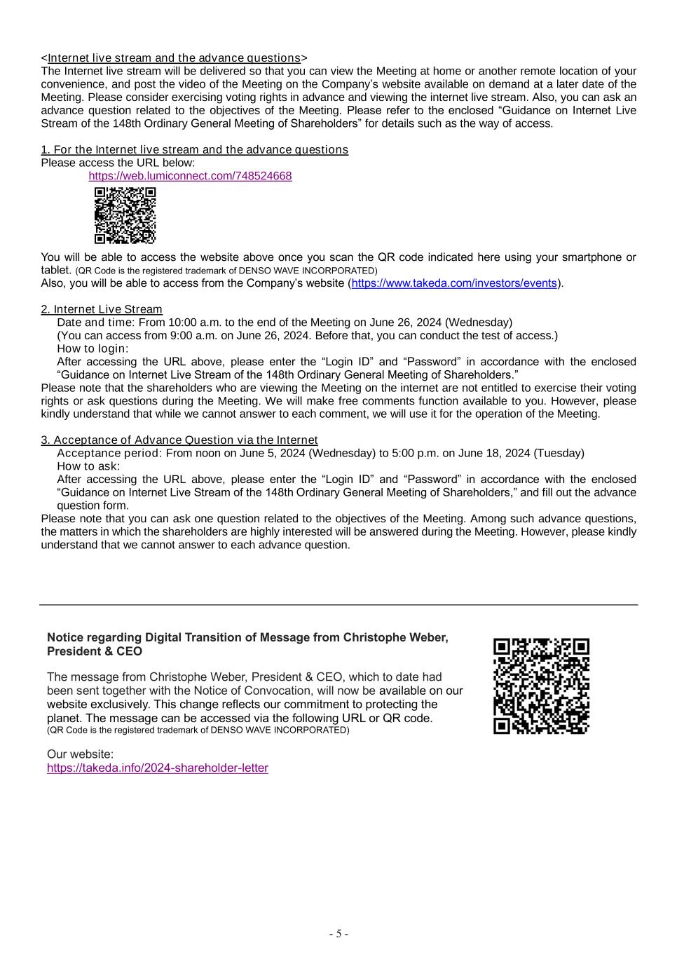 - 5 - <Internet live stream and the advance questions> The Internet live stream will be delivered so that you can view the Meeting at home or another remote location of your convenience, and post the video of the Meeting on the Company’s website available on demand at a later date of the Meeting. Please consider exercising voting rights in advance and viewing the internet live stream. Also, you can ask an advance question related to the objectives of the Meeting. Please refer to the enclosed “Guidance on Internet Live Stream of the 148th Ordinary General Meeting of Shareholders” for details such as the way of access. 1. For the Internet live stream and the advance questions Please access the URL below: https://web.lumiconnect.com/748524668 You will be able to access the website above once you scan the QR code indicated here using your smartphone or tablet. (QR Code is the registered trademark of DENSO WAVE INCORPORATED) Also, you will be able to access from the Company’s website (https://www.takeda.com/investors/events). 2. Internet Live Stream Date and time: From 10:00 a.m. to the end of the Meeting on June 26, 2024 (Wednesday) (You can access from 9:00 a.m. on June 26, 2024. Before that, you can conduct the test of access.) How to login: After accessing the URL above, please enter the “Login ID” and “Password” in accordance with the enclosed “Guidance on Internet Live Stream of the 148th Ordinary General Meeting of Shareholders.” Please note that the shareholders who are viewing the Meeting on the internet are not entitled to exercise their voting rights or ask questions during the Meeting. We will make free comments function available to you. However, please kindly understand that while we cannot answer to each comment, we will use it for the operation of the Meeting. 3. Acceptance of Advance Question via the Internet Acceptance period: From noon on June 5, 2024 (Wednesday) to 5:00 p.m. on June 18, 2024 (Tuesday) How to ask: After accessing the URL above, please enter the “Login ID” and “Password” in accordance with the enclosed “Guidance on Internet Live Stream of the 148th Ordinary General Meeting of Shareholders,” and fill out the advance question form. Please note that you can ask one question related to the objectives of the Meeting. Among such advance questions, the matters in which the shareholders are highly interested will be answered during the Meeting. However, please kindly understand that we cannot answer to each advance question. Notice regarding Digital Transition of Message from Christophe Weber, President & CEO The message from Christophe Weber, President & CEO, which to date had been sent together with the Notice of Convocation, will now be available on our website exclusively. This change reflects our commitment to protecting the planet. The message can be accessed via the following URL or QR code. (QR Code is the registered trademark of DENSO WAVE INCORPORATED) Our website: https://takeda.info/2024-shareholder-letter