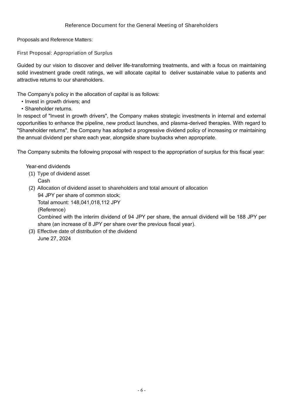 - 6 - Reference Document for the General Meeting of Shareholders Proposals and Reference Matters: First Proposal: Appropriation of Surplus Guided by our vision to discover and deliver life-transforming treatments, and with a focus on maintaining solid investment grade credit ratings, we will allocate capital to deliver sustainable value to patients and attractive returns to our shareholders. The Company’s policy in the allocation of capital is as follows: • Invest in growth drivers; and • Shareholder returns. In respect of "Invest in growth drivers", the Company makes strategic investments in internal and external opportunities to enhance the pipeline, new product launches, and plasma-derived therapies. With regard to "Shareholder returns", the Company has adopted a progressive dividend policy of increasing or maintaining the annual dividend per share each year, alongside share buybacks when appropriate. The Company submits the following proposal with respect to the appropriation of surplus for this fiscal year: Year-end dividends (1) Type of dividend asset Cash (2) Allocation of dividend asset to shareholders and total amount of allocation 94 JPY per share of common stock; Total amount: 148,041,018,112 JPY (Reference) Combined with the interim dividend of 94 JPY per share, the annual dividend will be 188 JPY per share (an increase of 8 JPY per share over the previous fiscal year). (3) Effective date of distribution of the dividend June 27, 2024