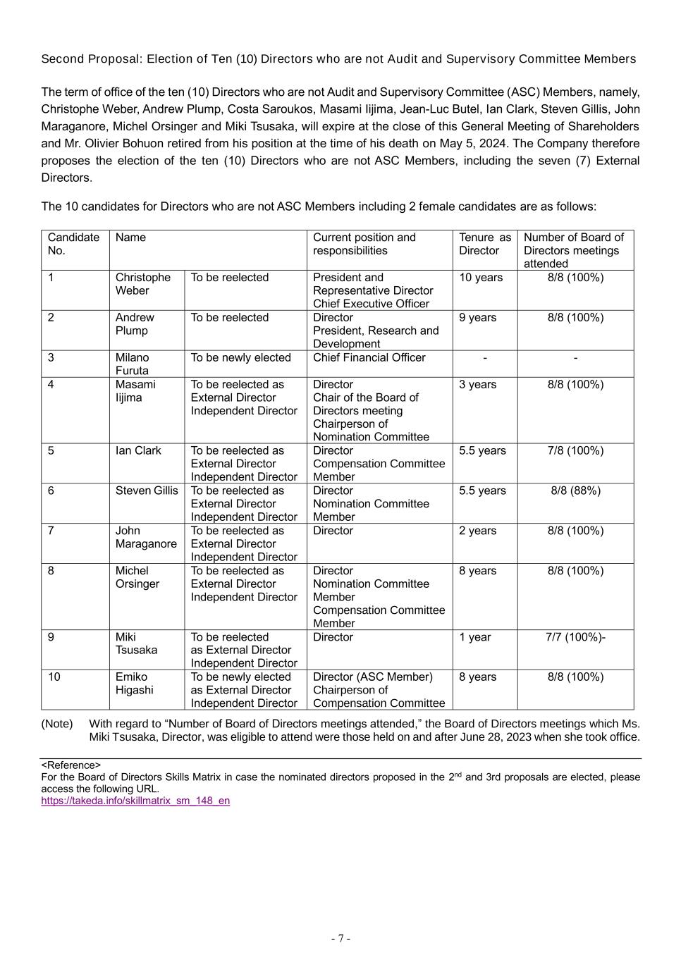 - 7 - Second Proposal: Election of Ten (10) Directors who are not Audit and Supervisory Committee Members The term of office of the ten (10) Directors who are not Audit and Supervisory Committee (ASC) Members, namely, Christophe Weber, Andrew Plump, Costa Saroukos, Masami Iijima, Jean-Luc Butel, Ian Clark, Steven Gillis, John Maraganore, Michel Orsinger and Miki Tsusaka, will expire at the close of this General Meeting of Shareholders and Mr. Olivier Bohuon retired from his position at the time of his death on May 5, 2024. The Company therefore proposes the election of the ten (10) Directors who are not ASC Members, including the seven (7) External Directors. The 10 candidates for Directors who are not ASC Members including 2 female candidates are as follows: Candidate No. Name Current position and responsibilities Tenure as Director Number of Board of Directors meetings attended 1 Christophe Weber To be reelected President and Representative Director Chief Executive Officer 10 years 8/8 (100%) 2 Andrew Plump To be reelected Director President, Research and Development 9 years 8/8 (100%) 3 Milano Furuta To be newly elected Chief Financial Officer - - 4 Masami Iijima To be reelected as External Director Independent Director Director Chair of the Board of Directors meeting Chairperson of Nomination Committee 3 years 8/8 (100%) 5 Ian Clark To be reelected as External Director Independent Director Director Compensation Committee Member 5.5 years 7/8 (100%) 6 Steven Gillis To be reelected as External Director Independent Director Director Nomination Committee Member 5.5 years 8/8 (88%) 7 John Maraganore To be reelected as External Director Independent Director Director 2 years 8/8 (100%) 8 Michel Orsinger To be reelected as External Director Independent Director Director Nomination Committee Member Compensation Committee Member 8 years 8/8 (100%) 9 Miki Tsusaka To be reelected as External Director Independent Director Director 1 year 7/7 (100%)- 10 Emiko Higashi To be newly elected as External Director Independent Director Director (ASC Member) Chairperson of Compensation Committee 8 years 8/8 (100%) (Note) With regard to “Number of Board of Directors meetings attended,” the Board of Directors meetings which Ms. Miki Tsusaka, Director, was eligible to attend were those held on and after June 28, 2023 when she took office. <Reference> For the Board of Directors Skills Matrix in case the nominated directors proposed in the 2nd and 3rd proposals are elected, please access the following URL. https://takeda.info/skillmatrix_sm_148_en