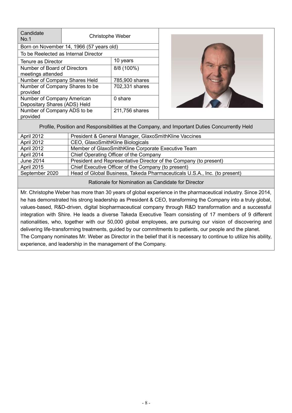- 8 - Candidate No.1 Christophe Weber Born on November 14, 1966 (57 years old) To be Reelected as Internal Director Tenure as Director 10 years Number of Board of Directors meetings attended 8/8 (100%) Number of Company Shares Held 785,900 shares Number of Company Shares to be provided 702,331 shares Number of Company American Depositary Shares (ADS) Held 0 share Number of Company ADS to be provided 211,756 shares Profile, Position and Responsibilities at the Company, and Important Duties Concurrently Held April 2012 President & General Manager, GlaxoSmithKline Vaccines April 2012 CEO, GlaxoSmithKline Biologicals April 2012 Member of GlaxoSmithKline Corporate Executive Team April 2014 Chief Operating Officer of the Company June 2014 President and Representative Director of the Company (to present) April 2015 Chief Executive Officer of the Company (to present) September 2020 Head of Global Business, Takeda Pharmaceuticals U.S.A., Inc. (to present) Rationale for Nomination as Candidate for Director Mr. Christophe Weber has more than 30 years of global experience in the pharmaceutical industry. Since 2014, he has demonstrated his strong leadership as President & CEO, transforming the Company into a truly global, values-based, R&D-driven, digital biopharmaceutical company through R&D transformation and a successful integration with Shire. He leads a diverse Takeda Executive Team consisting of 17 members of 9 different nationalities, who, together with our 50,000 global employees, are pursuing our vision of discovering and delivering life-transforming treatments, guided by our commitments to patients, our people and the planet. The Company nominates Mr. Weber as Director in the belief that it is necessary to continue to utilize his ability, experience, and leadership in the management of the Company.