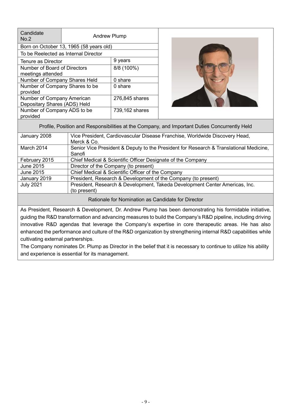 - 9 - Candidate No.2 Andrew Plump Born on October 13, 1965 (58 years old) To be Reelected as Internal Director Tenure as Director 9 years Number of Board of Directors meetings attended 8/8 (100%) Number of Company Shares Held 0 share Number of Company Shares to be provided 0 share Number of Company American Depositary Shares (ADS) Held 276,845 shares Number of Company ADS to be provided 739,162 shares Profile, Position and Responsibilities at the Company, and Important Duties Concurrently Held January 2008 Vice President, Cardiovascular Disease Franchise, Worldwide Discovery Head, Merck & Co. March 2014 Senior Vice President & Deputy to the President for Research & Translational Medicine, Sanofi February 2015 Chief Medical & Scientific Officer Designate of the Company June 2015 Director of the Company (to present) June 2015 Chief Medical & Scientific Officer of the Company January 2019 President, Research & Development of the Company (to present) July 2021 President, Research & Development, Takeda Development Center Americas, Inc. (to present) Rationale for Nomination as Candidate for Director As President, Research & Development, Dr. Andrew Plump has been demonstrating his formidable initiative, guiding the R&D transformation and advancing measures to build the Company’s R&D pipeline, including driving innovative R&D agendas that leverage the Company’s expertise in core therapeutic areas. He has also enhanced the performance and culture of the R&D organization by strengthening internal R&D capabilities while cultivating external partnerships. The Company nominates Dr. Plump as Director in the belief that it is necessary to continue to utilize his ability and experience is essential for its management.