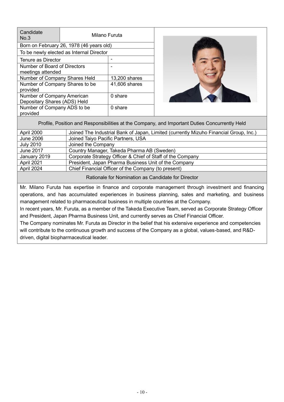 - 10 - Candidate No.3 Milano Furuta Born on February 26, 1978 (46 years old) To be newly elected as Internal Director Tenure as Director - Number of Board of Directors meetings attended - Number of Company Shares Held 13,200 shares Number of Company Shares to be provided 41,606 shares Number of Company American Depositary Shares (ADS) Held 0 share Number of Company ADS to be provided 0 share Profile, Position and Responsibilities at the Company, and Important Duties Concurrently Held April 2000 Joined The Industrial Bank of Japan, Limited (currently Mizuho Financial Group, Inc.) June 2006 Joined Taiyo Pacific Partners, USA July 2010 Joined the Company June 2017 Country Manager, Takeda Pharma AB (Sweden) January 2019 Corporate Strategy Officer & Chief of Staff of the Company April 2021 President, Japan Pharma Business Unit of the Company April 2024 Chief Financial Officer of the Company (to present) Rationale for Nomination as Candidate for Director Mr. Milano Furuta has expertise in finance and corporate management through investment and financing operations, and has accumulated experiences in business planning, sales and marketing, and business management related to pharmaceutical business in multiple countries at the Company. In recent years, Mr. Furuta, as a member of the Takeda Executive Team, served as Corporate Strategy Officer and President, Japan Pharma Business Unit, and currently serves as Chief Financial Officer. The Company nominates Mr. Furuta as Director in the belief that his extensive experience and competencies will contribute to the continuous growth and success of the Company as a global, values-based, and R&D- driven, digital biopharmaceutical leader.