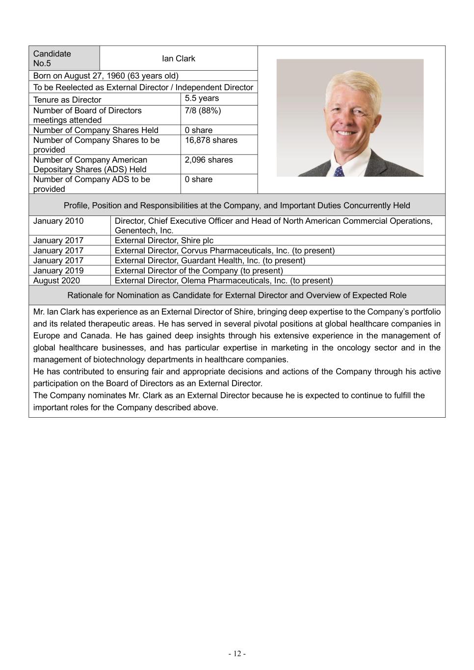 - 12 - Candidate No.5 Ian Clark Born on August 27, 1960 (63 years old) To be Reelected as External Director / Independent Director Tenure as Director 5.5 years Number of Board of Directors meetings attended 7/8 (88%) Number of Company Shares Held 0 share Number of Company Shares to be provided 16,878 shares Number of Company American Depositary Shares (ADS) Held 2,096 shares Number of Company ADS to be provided 0 share Profile, Position and Responsibilities at the Company, and Important Duties Concurrently Held January 2010 Director, Chief Executive Officer and Head of North American Commercial Operations, Genentech, Inc. January 2017 External Director, Shire plc January 2017 External Director, Corvus Pharmaceuticals, Inc. (to present) January 2017 External Director, Guardant Health, Inc. (to present) January 2019 External Director of the Company (to present) August 2020 External Director, Olema Pharmaceuticals, Inc. (to present) Rationale for Nomination as Candidate for External Director and Overview of Expected Role Mr. Ian Clark has experience as an External Director of Shire, bringing deep expertise to the Company’s portfolio and its related therapeutic areas. He has served in several pivotal positions at global healthcare companies in Europe and Canada. He has gained deep insights through his extensive experience in the management of global healthcare businesses, and has particular expertise in marketing in the oncology sector and in the management of biotechnology departments in healthcare companies. He has contributed to ensuring fair and appropriate decisions and actions of the Company through his active participation on the Board of Directors as an External Director. The Company nominates Mr. Clark as an External Director because he is expected to continue to fulfill the important roles for the Company described above.