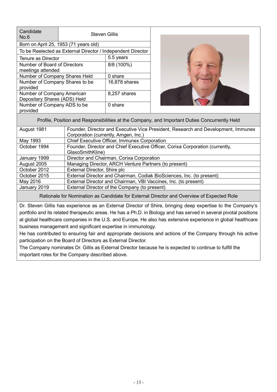 - 13 - Candidate No.6 Steven Gillis Born on April 25, 1953 (71 years old) To be Reelected as External Director / Independent Director Tenure as Director 5.5 years Number of Board of Directors meetings attended 8/8 (100%) Number of Company Shares Held 0 share Number of Company Shares to be provided 16,878 shares Number of Company American Depositary Shares (ADS) Held 8,257 shares Number of Company ADS to be provided 0 share Profile, Position and Responsibilities at the Company, and Important Duties Concurrently Held August 1981 Founder, Director and Executive Vice President, Research and Development, Immunex Corporation (currently, Amgen, Inc.) May 1993 Chief Executive Officer, Immunex Corporation October 1994 Founder, Director and Chief Executive Officer, Corixa Corporation (currently, GlaxoSmithKline) January 1999 Director and Chairman, Corixa Corporation August 2005 Managing Director, ARCH Venture Partners (to present) October 2012 External Director, Shire plc October 2015 External Director and Chairman, Codiak BioSciences, Inc. (to present) May 2016 External Director and Chairman, VBI Vaccines, Inc. (to present) January 2019 External Director of the Company (to present) Rationale for Nomination as Candidate for External Director and Overview of Expected Role Dr. Steven Gillis has experience as an External Director of Shire, bringing deep expertise to the Company’s portfolio and its related therapeutic areas. He has a Ph.D. in Biology and has served in several pivotal positions at global healthcare companies in the U.S. and Europe. He also has extensive experience in global healthcare business management and significant expertise in immunology. He has contributed to ensuring fair and appropriate decisions and actions of the Company through his active participation on the Board of Directors as External Director. The Company nominates Dr. Gillis as External Director because he is expected to continue to fulfill the important roles for the Company described above.