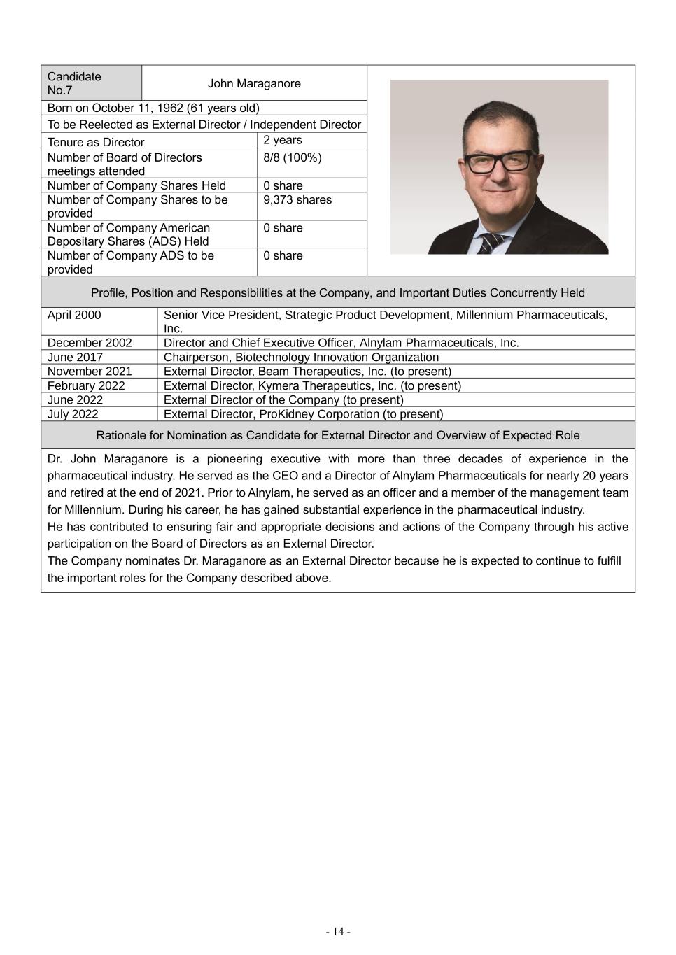 - 14 - Candidate No.7 John Maraganore Born on October 11, 1962 (61 years old) To be Reelected as External Director / Independent Director Tenure as Director 2 years Number of Board of Directors meetings attended 8/8 (100%) Number of Company Shares Held 0 share Number of Company Shares to be provided 9,373 shares Number of Company American Depositary Shares (ADS) Held 0 share Number of Company ADS to be provided 0 share Profile, Position and Responsibilities at the Company, and Important Duties Concurrently Held April 2000 Senior Vice President, Strategic Product Development, Millennium Pharmaceuticals, Inc. December 2002 Director and Chief Executive Officer, Alnylam Pharmaceuticals, Inc. June 2017 Chairperson, Biotechnology Innovation Organization November 2021 External Director, Beam Therapeutics, Inc. (to present) February 2022 External Director, Kymera Therapeutics, Inc. (to present) June 2022 External Director of the Company (to present) July 2022 External Director, ProKidney Corporation (to present) Rationale for Nomination as Candidate for External Director and Overview of Expected Role Dr. John Maraganore is a pioneering executive with more than three decades of experience in the pharmaceutical industry. He served as the CEO and a Director of Alnylam Pharmaceuticals for nearly 20 years and retired at the end of 2021. Prior to Alnylam, he served as an officer and a member of the management team for Millennium. During his career, he has gained substantial experience in the pharmaceutical industry. He has contributed to ensuring fair and appropriate decisions and actions of the Company through his active participation on the Board of Directors as an External Director. The Company nominates Dr. Maraganore as an External Director because he is expected to continue to fulfill the important roles for the Company described above.