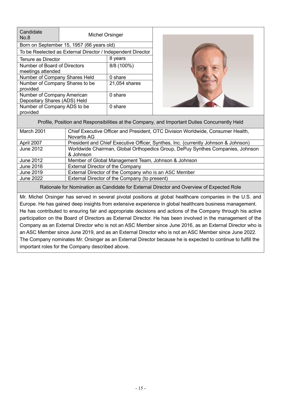 - 15 - Candidate No.8 Michel Orsinger Born on September 15, 1957 (66 years old) To be Reelected as External Director / Independent Director Tenure as Director 8 years Number of Board of Directors meetings attended 8/8 (100%) Number of Company Shares Held 0 share Number of Company Shares to be provided 21,054 shares Number of Company American Depositary Shares (ADS) Held 0 share Number of Company ADS to be provided 0 share Profile, Position and Responsibilities at the Company, and Important Duties Concurrently Held March 2001 Chief Executive Officer and President, OTC Division Worldwide, Consumer Health, Novartis AG April 2007 President and Chief Executive Officer, Synthes, Inc. (currently Johnson & Johnson) June 2012 Worldwide Chairman, Global Orthopedics Group, DePuy Synthes Companies, Johnson & Johnson June 2012 Member of Global Management Team, Johnson & Johnson June 2016 External Director of the Company June 2019 External Director of the Company who is an ASC Member June 2022 External Director of the Company (to present) Rationale for Nomination as Candidate for External Director and Overview of Expected Role Mr. Michel Orsinger has served in several pivotal positions at global healthcare companies in the U.S. and Europe. He has gained deep insights from extensive experience in global healthcare business management. He has contributed to ensuring fair and appropriate decisions and actions of the Company through his active participation on the Board of Directors as External Director. He has been involved in the management of the Company as an External Director who is not an ASC Member since June 2016, as an External Director who is an ASC Member since June 2019, and as an External Director who is not an ASC Member since June 2022. The Company nominates Mr. Orsinger as an External Director because he is expected to continue to fulfill the important roles for the Company described above.