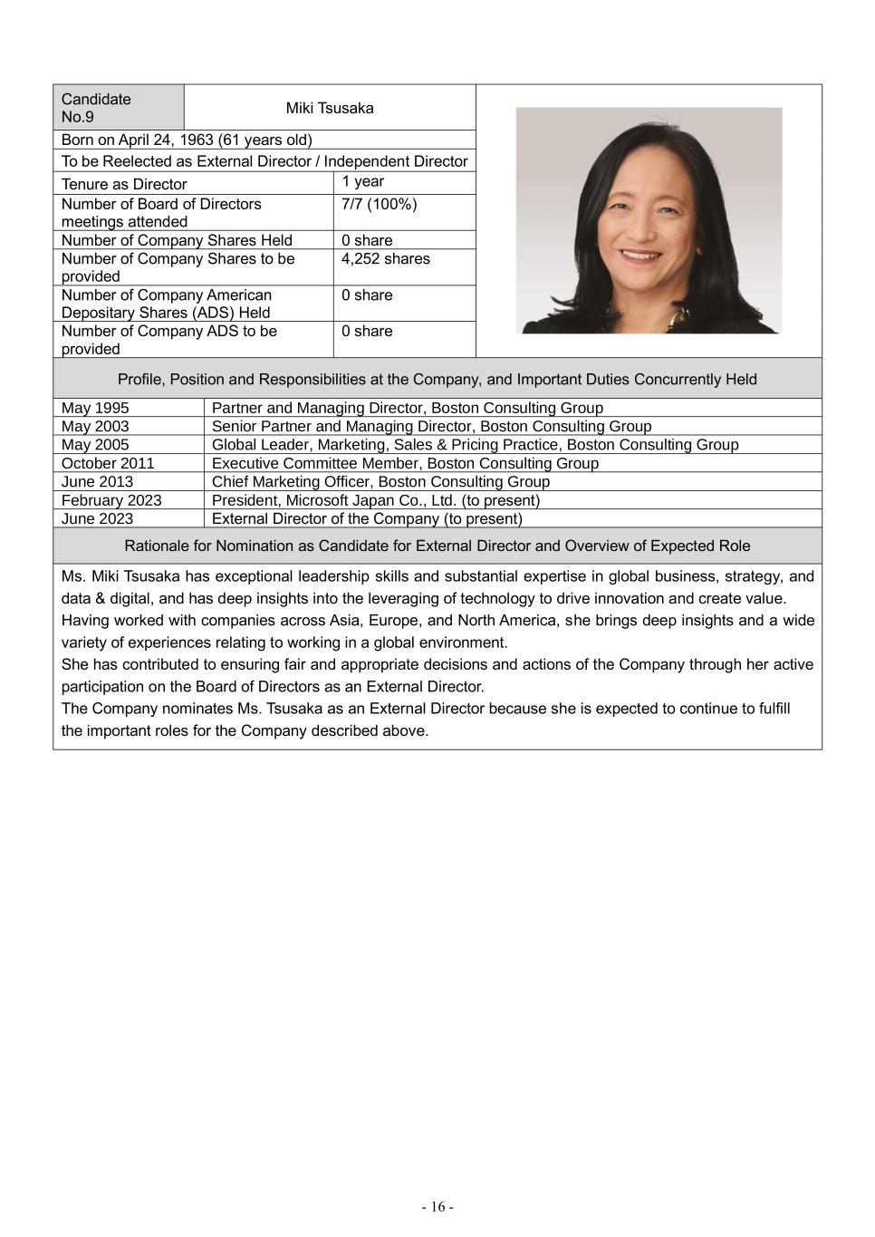 - 16 - Candidate No.9 Miki Tsusaka Born on April 24, 1963 (61 years old) To be Reelected as External Director / Independent Director Tenure as Director 1 year Number of Board of Directors meetings attended 7/7 (100%) Number of Company Shares Held 0 share Number of Company Shares to be provided 4,252 shares Number of Company American Depositary Shares (ADS) Held 0 share Number of Company ADS to be provided 0 share Profile, Position and Responsibilities at the Company, and Important Duties Concurrently Held May 1995 Partner and Managing Director, Boston Consulting Group May 2003 Senior Partner and Managing Director, Boston Consulting Group May 2005 Global Leader, Marketing, Sales & Pricing Practice, Boston Consulting Group October 2011 Executive Committee Member, Boston Consulting Group June 2013 Chief Marketing Officer, Boston Consulting Group February 2023 President, Microsoft Japan Co., Ltd. (to present) June 2023 External Director of the Company (to present) Rationale for Nomination as Candidate for External Director and Overview of Expected Role Ms. Miki Tsusaka has exceptional leadership skills and substantial expertise in global business, strategy, and data & digital, and has deep insights into the leveraging of technology to drive innovation and create value. Having worked with companies across Asia, Europe, and North America, she brings deep insights and a wide variety of experiences relating to working in a global environment. She has contributed to ensuring fair and appropriate decisions and actions of the Company through her active participation on the Board of Directors as an External Director. The Company nominates Ms. Tsusaka as an External Director because she is expected to continue to fulfill the important roles for the Company described above.