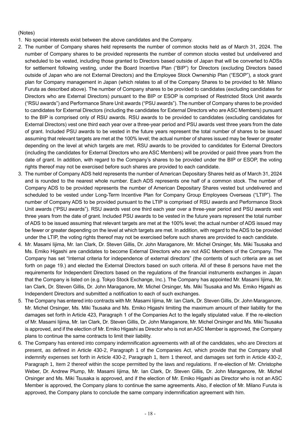 - 18 - (Notes) 1. No special interests exist between the above candidates and the Company. 2. The number of Company shares held represents the number of common stocks held as of March 31, 2024. The number of Company shares to be provided represents the number of common stocks vested but undelivered and scheduled to be vested, including those granted to Directors based outside of Japan that will be converted to ADSs for settlement following vesting, under the Board Incentive Plan (“BIP”) for Directors (excluding Directors based outside of Japan who are not External Directors) and the Employee Stock Ownership Plan (“ESOP”), a stock grant plan for Company management in Japan (which relates to all of the Company Shares to be provided to Mr. Milano Furuta as described above). The number of Company shares to be provided to candidates (excluding candidates for Directors who are External Directors) pursuant to the BIP or ESOP is comprised of Restricted Stock Unit awards (“RSU awards”) and Performance Share Unit awards (“PSU awards”). The number of Company shares to be provided to candidates for External Directors (including the candidates for External Directors who are ASC Members) pursuant to the BIP is comprised only of RSU awards. RSU awards to be provided to candidates (excluding candidates for External Directors) vest one third each year over a three-year period and PSU awards vest three years from the date of grant. Included PSU awards to be vested in the future years represent the total number of shares to be issued assuming that relevant targets are met at the 100% level; the actual number of shares issued may be fewer or greater depending on the level at which targets are met. RSU awards to be provided to candidates for External Directors (including the candidates for External Directors who are ASC Members) will be provided or paid three years from the date of grant. In addition, with regard to the Company’s shares to be provided under the BIP or ESOP, the voting rights thereof may not be exercised before such shares are provided to each candidate. 3. The number of Company ADS held represents the number of American Depositary Shares held as of March 31, 2024 and is rounded to the nearest whole number. Each ADS represents one half of a common stock. The number of Company ADS to be provided represents the number of American Depositary Shares vested but undelivered and scheduled to be vested under Long-Term Incentive Plan for Company Group Employees Overseas (“LTIP”). The number of Company ADS to be provided pursuant to the LTIP is comprised of RSU awards and Performance Stock Unit awards (“PSU awards”). RSU awards vest one third each year over a three-year period and PSU awards vest three years from the date of grant. Included PSU awards to be vested in the future years represent the total number of ADS to be issued assuming that relevant targets are met at the 100% level; the actual number of ADS issued may be fewer or greater depending on the level at which targets are met. In addition, with regard to the ADS to be provided under the LTIP, the voting rights thereof may not be exercised before such shares are provided to each candidate. 4. Mr. Masami Iijima, Mr. Ian Clark, Dr. Steven Gillis, Dr. John Maraganore, Mr. Michel Orsinger, Ms. Miki Tsusaka and Ms. Emiko Higashi are candidates to become External Directors who are not ASC Members of the Company. The Company has set “Internal criteria for independence of external directors” (the contents of such criteria are as set forth on page 19.) and elected the External Directors based on such criteria. All of these 8 persons have met the requirements for Independent Directors based on the regulations of the financial instruments exchanges in Japan that the Company is listed on (e.g. Tokyo Stock Exchange, Inc.). The Company has appointed Mr. Masami Iijima, Mr. Ian Clark, Dr. Steven Gillis, Dr. John Maraganore, Mr. Michel Orsinger, Ms. Miki Tsusaka and Ms. Emiko Higashi as Independent Directors and submitted a notification to each of such exchanges. 5. The Company has entered into contracts with Mr. Masami Iijima, Mr. Ian Clark, Dr. Steven Gillis, Dr. John Maraganore, Mr. Michel Orsinger, Ms. Miki Tsusaka and Ms. Emiko Higashi limiting the maximum amount of their liability for the damages set forth in Article 423, Paragraph 1 of the Companies Act to the legally stipulated value. If the re-election of Mr. Masami Iijima, Mr. Ian Clark, Dr. Steven Gillis, Dr. John Maraganore, Mr. Michel Orsinger and Ms. Miki Tsusaka is approved, and if the election of Mr. Emiko Higashi as Director who is not an ASC Member is approved, the Company plans to continue the same contracts to limit their liability. 6. The Company has entered into company indemnification agreements with all of the candidates, who are Directors at present, as defined in Article 430-2, Paragraph 1 of the Companies Act, which provide that the Company shall indemnify expenses set forth in Article 430-2, Paragraph 1, Item 1 thereof, and damages set forth in Article 430-2, Paragraph 1, Item 2 thereof within the scope permitted by the laws and regulations. If re-election of Mr. Christophe Weber, Dr. Andrew Plump, Mr. Masami Iijima, Mr. Ian Clark, Dr. Steven Gillis, Dr. John Maraganore, Mr. Michel Orsinger and Ms. Miki Tsusaka is approved, and if the election of Mr. Emiko Higashi as Director who is not an ASC Member is approved, the Company plans to continue the same agreements. Also, if election of Mr. Milano Furuta is approved, the Company plans to conclude the same company indemnification agreement with him.