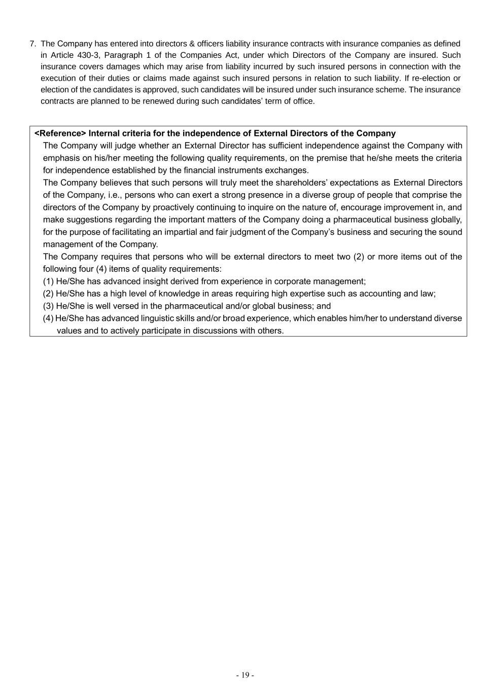 - 19 - 7. The Company has entered into directors & officers liability insurance contracts with insurance companies as defined in Article 430-3, Paragraph 1 of the Companies Act, under which Directors of the Company are insured. Such insurance covers damages which may arise from liability incurred by such insured persons in connection with the execution of their duties or claims made against such insured persons in relation to such liability. If re-election or election of the candidates is approved, such candidates will be insured under such insurance scheme. The insurance contracts are planned to be renewed during such candidates’ term of office. <Reference> Internal criteria for the independence of External Directors of the Company The Company will judge whether an External Director has sufficient independence against the Company with emphasis on his/her meeting the following quality requirements, on the premise that he/she meets the criteria for independence established by the financial instruments exchanges. The Company believes that such persons will truly meet the shareholders’ expectations as External Directors of the Company, i.e., persons who can exert a strong presence in a diverse group of people that comprise the directors of the Company by proactively continuing to inquire on the nature of, encourage improvement in, and make suggestions regarding the important matters of the Company doing a pharmaceutical business globally, for the purpose of facilitating an impartial and fair judgment of the Company’s business and securing the sound management of the Company. The Company requires that persons who will be external directors to meet two (2) or more items out of the following four (4) items of quality requirements: (1) He/She has advanced insight derived from experience in corporate management; (2) He/She has a high level of knowledge in areas requiring high expertise such as accounting and law; (3) He/She is well versed in the pharmaceutical and/or global business; and (4) He/She has advanced linguistic skills and/or broad experience, which enables him/her to understand diverse values and to actively participate in discussions with others.