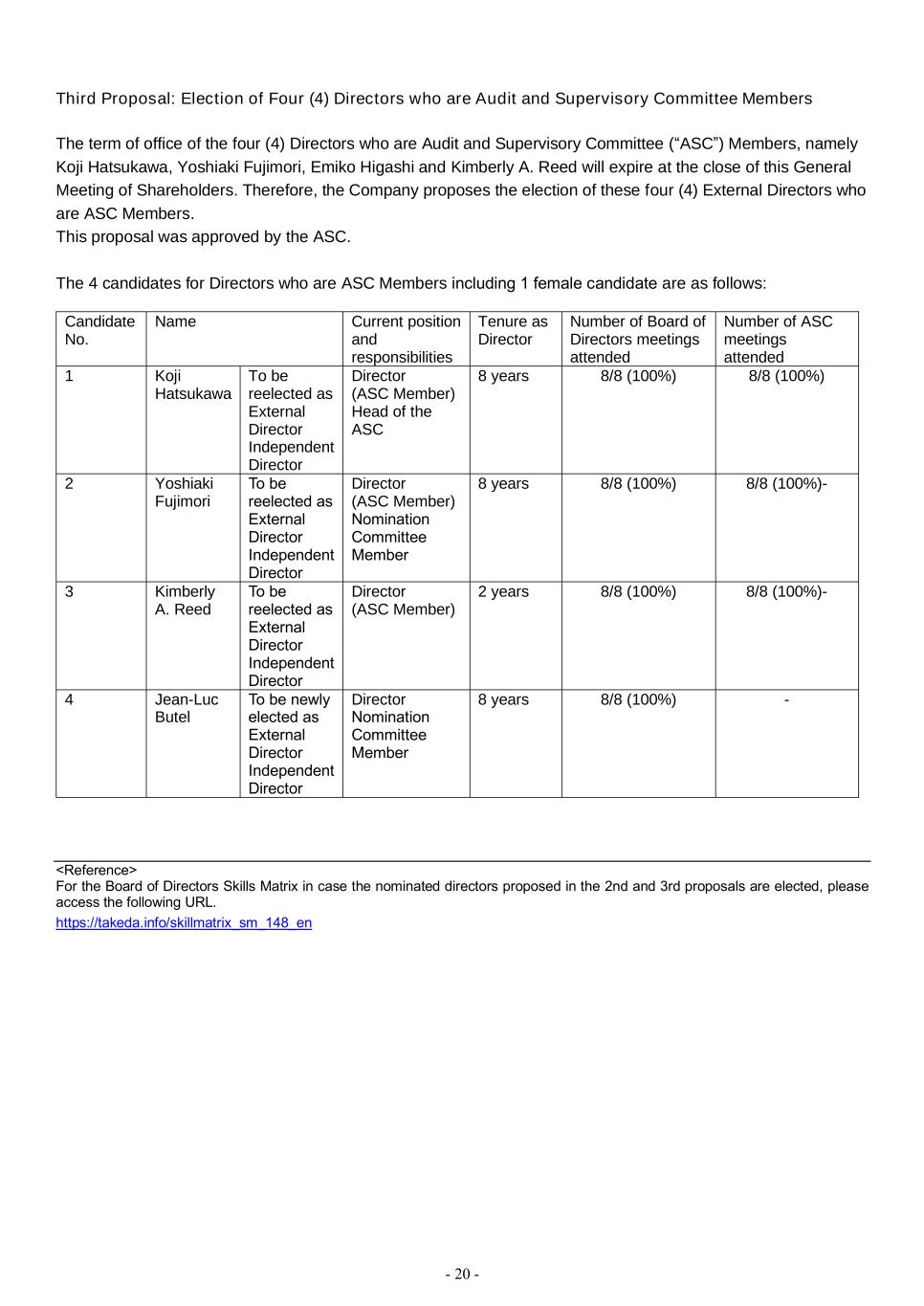 - 20 - Third Proposal: Election of Four (4) Directors who are Audit and Supervisory Committee Members The term of office of the four (4) Directors who are Audit and Supervisory Committee (“ASC”) Members, namely Koji Hatsukawa, Yoshiaki Fujimori, Emiko Higashi and Kimberly A. Reed will expire at the close of this General Meeting of Shareholders. Therefore, the Company proposes the election of these four (4) External Directors who are ASC Members. This proposal was approved by the ASC. The 4 candidates for Directors who are ASC Members including 1 female candidate are as follows: Candidate No. Name Current position and responsibilities Tenure as Director Number of Board of Directors meetings attended Number of ASC meetings attended 1 Koji Hatsukawa To be reelected as External Director Independent Director Director (ASC Member) Head of the ASC 8 years 8/8 (100%) 8/8 (100%) 2 Yoshiaki Fujimori To be reelected as External Director Independent Director Director (ASC Member) Nomination Committee Member 8 years 8/8 (100%) 8/8 (100%)- 3 Kimberly A. Reed To be reelected as External Director Independent Director Director (ASC Member) 2 years 8/8 (100%) 8/8 (100%)- 4 Jean-Luc Butel To be newly elected as External Director Independent Director Director Nomination Committee Member 8 years 8/8 (100%) - <Reference> For the Board of Directors Skills Matrix in case the nominated directors proposed in the 2nd and 3rd proposals are elected, please access the following URL. https://takeda.info/skillmatrix_sm_148_en