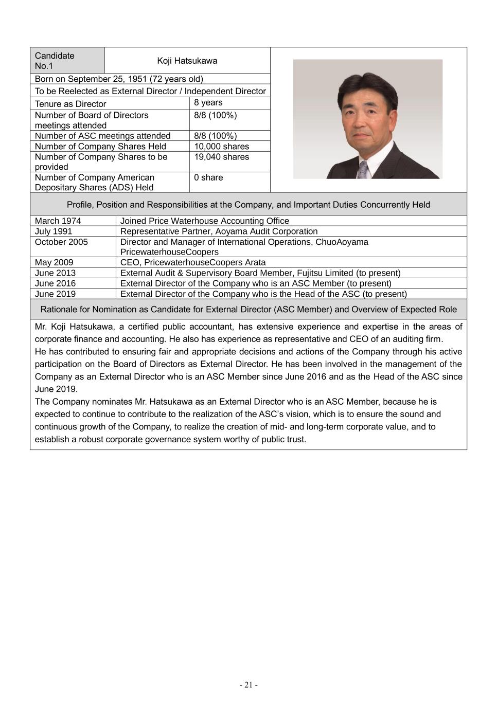 - 21 - Candidate No.1 Koji Hatsukawa Born on September 25, 1951 (72 years old) To be Reelected as External Director / Independent Director Tenure as Director 8 years Number of Board of Directors meetings attended 8/8 (100%) Number of ASC meetings attended 8/8 (100%) Number of Company Shares Held 10,000 shares Number of Company Shares to be provided 19,040 shares Number of Company American Depositary Shares (ADS) Held 0 share Profile, Position and Responsibilities at the Company, and Important Duties Concurrently Held March 1974 Joined Price Waterhouse Accounting Office July 1991 Representative Partner, Aoyama Audit Corporation October 2005 Director and Manager of International Operations, ChuoAoyama PricewaterhouseCoopers May 2009 CEO, PricewaterhouseCoopers Arata June 2013 External Audit & Supervisory Board Member, Fujitsu Limited (to present) June 2016 External Director of the Company who is an ASC Member (to present) June 2019 External Director of the Company who is the Head of the ASC (to present) Rationale for Nomination as Candidate for External Director (ASC Member) and Overview of Expected Role Mr. Koji Hatsukawa, a certified public accountant, has extensive experience and expertise in the areas of corporate finance and accounting. He also has experience as representative and CEO of an auditing firm. He has contributed to ensuring fair and appropriate decisions and actions of the Company through his active participation on the Board of Directors as External Director. He has been involved in the management of the Company as an External Director who is an ASC Member since June 2016 and as the Head of the ASC since June 2019. The Company nominates Mr. Hatsukawa as an External Director who is an ASC Member, because he is expected to continue to contribute to the realization of the ASC’s vision, which is to ensure the sound and continuous growth of the Company, to realize the creation of mid- and long-term corporate value, and to establish a robust corporate governance system worthy of public trust.