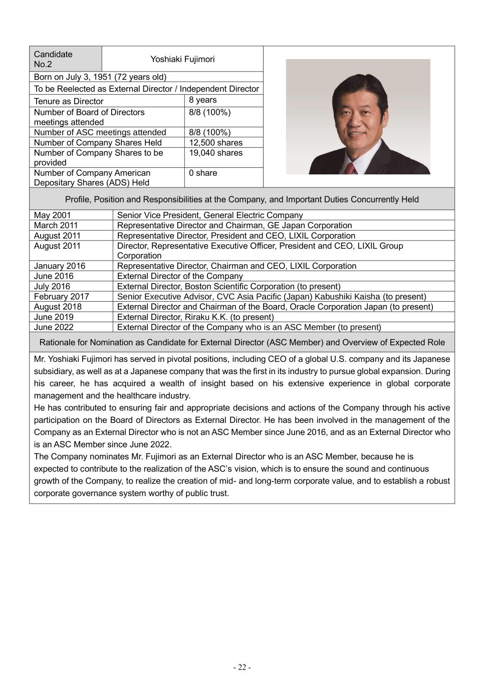 - 22 - Candidate No.2 Yoshiaki Fujimori Born on July 3, 1951 (72 years old) To be Reelected as External Director / Independent Director Tenure as Director 8 years Number of Board of Directors meetings attended 8/8 (100%) Number of ASC meetings attended 8/8 (100%) Number of Company Shares Held 12,500 shares Number of Company Shares to be provided 19,040 shares Number of Company American Depositary Shares (ADS) Held 0 share Profile, Position and Responsibilities at the Company, and Important Duties Concurrently Held May 2001 Senior Vice President, General Electric Company March 2011 Representative Director and Chairman, GE Japan Corporation August 2011 Representative Director, President and CEO, LIXIL Corporation August 2011 Director, Representative Executive Officer, President and CEO, LIXIL Group Corporation January 2016 Representative Director, Chairman and CEO, LIXIL Corporation June 2016 External Director of the Company July 2016 External Director, Boston Scientific Corporation (to present) February 2017 Senior Executive Advisor, CVC Asia Pacific (Japan) Kabushiki Kaisha (to present) August 2018 External Director and Chairman of the Board, Oracle Corporation Japan (to present) June 2019 External Director, Riraku K.K. (to present) June 2022 External Director of the Company who is an ASC Member (to present) Rationale for Nomination as Candidate for External Director (ASC Member) and Overview of Expected Role Mr. Yoshiaki Fujimori has served in pivotal positions, including CEO of a global U.S. company and its Japanese subsidiary, as well as at a Japanese company that was the first in its industry to pursue global expansion. During his career, he has acquired a wealth of insight based on his extensive experience in global corporate management and the healthcare industry. He has contributed to ensuring fair and appropriate decisions and actions of the Company through his active participation on the Board of Directors as External Director. He has been involved in the management of the Company as an External Director who is not an ASC Member since June 2016, and as an External Director who is an ASC Member since June 2022. The Company nominates Mr. Fujimori as an External Director who is an ASC Member, because he is expected to contribute to the realization of the ASC’s vision, which is to ensure the sound and continuous growth of the Company, to realize the creation of mid- and long-term corporate value, and to establish a robust corporate governance system worthy of public trust.