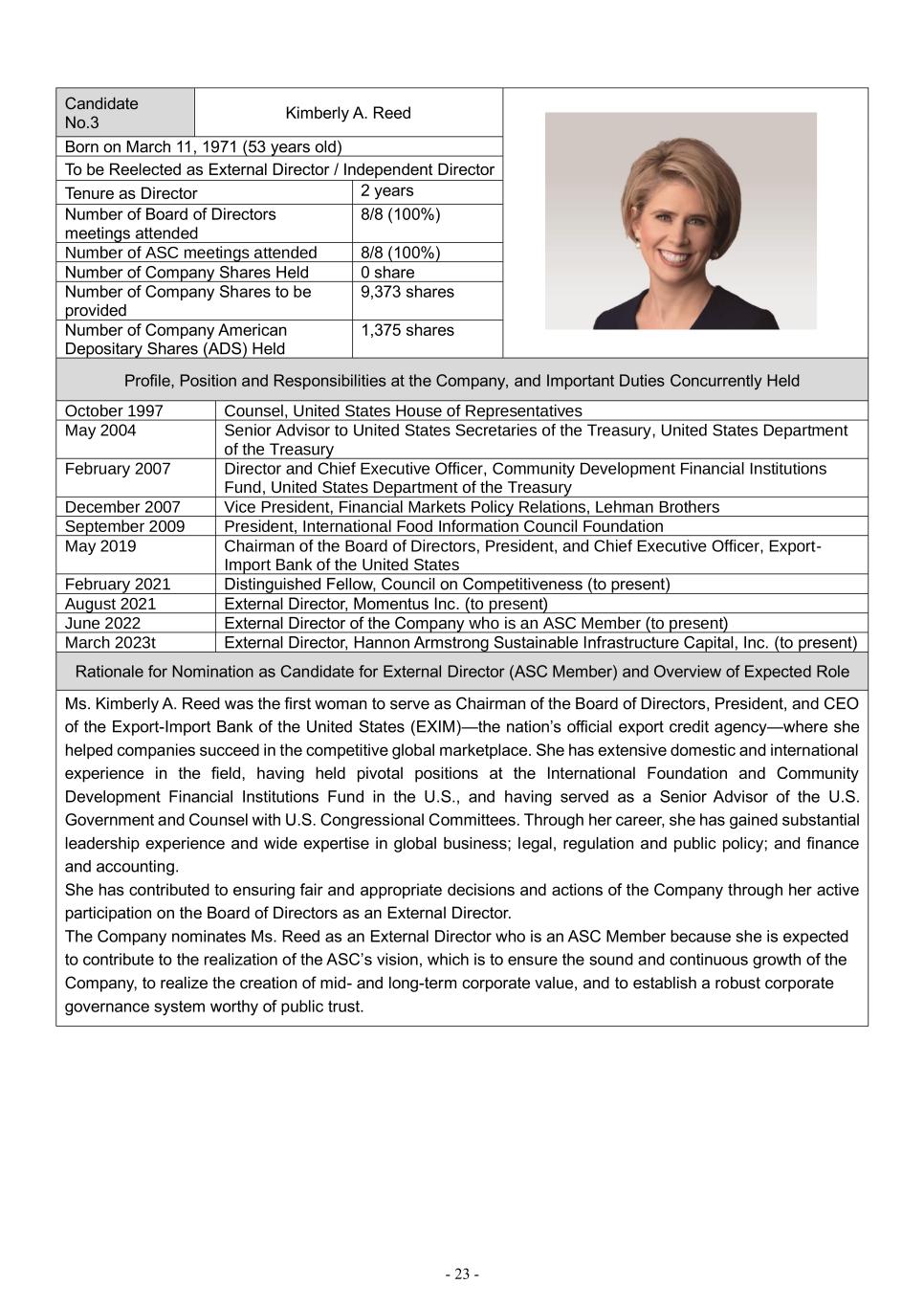 - 23 - Candidate No.3 Kimberly A. Reed Born on March 11, 1971 (53 years old) To be Reelected as External Director / Independent Director Tenure as Director 2 years Number of Board of Directors meetings attended 8/8 (100%) Number of ASC meetings attended 8/8 (100%) Number of Company Shares Held 0 share Number of Company Shares to be provided 9,373 shares Number of Company American Depositary Shares (ADS) Held 1,375 shares Profile, Position and Responsibilities at the Company, and Important Duties Concurrently Held October 1997 Counsel, United States House of Representatives May 2004 Senior Advisor to United States Secretaries of the Treasury, United States Department of the Treasury February 2007 Director and Chief Executive Officer, Community Development Financial Institutions Fund, United States Department of the Treasury December 2007 Vice President, Financial Markets Policy Relations, Lehman Brothers September 2009 President, International Food Information Council Foundation May 2019 Chairman of the Board of Directors, President, and Chief Executive Officer, Export- Import Bank of the United States February 2021 Distinguished Fellow, Council on Competitiveness (to present) August 2021 External Director, Momentus Inc. (to present) June 2022 External Director of the Company who is an ASC Member (to present) March 2023t External Director, Hannon Armstrong Sustainable Infrastructure Capital, Inc. (to present) Rationale for Nomination as Candidate for External Director (ASC Member) and Overview of Expected Role Ms. Kimberly A. Reed was the first woman to serve as Chairman of the Board of Directors, President, and CEO of the Export-Import Bank of the United States (EXIM)—the nation’s official export credit agency—where she helped companies succeed in the competitive global marketplace. She has extensive domestic and international experience in the field, having held pivotal positions at the International Foundation and Community Development Financial Institutions Fund in the U.S., and having served as a Senior Advisor of the U.S. Government and Counsel with U.S. Congressional Committees. Through her career, she has gained substantial leadership experience and wide expertise in global business; legal, regulation and public policy; and finance and accounting. She has contributed to ensuring fair and appropriate decisions and actions of the Company through her active participation on the Board of Directors as an External Director. The Company nominates Ms. Reed as an External Director who is an ASC Member because she is expected to contribute to the realization of the ASC’s vision, which is to ensure the sound and continuous growth of the Company, to realize the creation of mid- and long-term corporate value, and to establish a robust corporate governance system worthy of public trust.