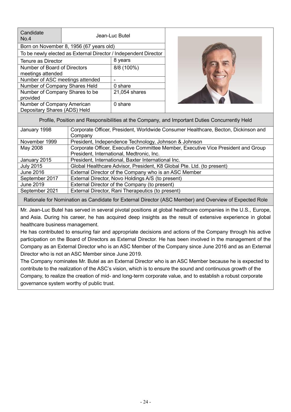 - 24 - Candidate No.4 Jean-Luc Butel Born on November 8, 1956 (67 years old) To be newly elected as External Director / Independent Director Tenure as Director 8 years Number of Board of Directors meetings attended 8/8 (100%) Number of ASC meetings attended - Number of Company Shares Held 0 share Number of Company Shares to be provided 21,054 shares Number of Company American Depositary Shares (ADS) Held 0 share Profile, Position and Responsibilities at the Company, and Important Duties Concurrently Held January 1998 Corporate Officer, President, Worldwide Consumer Healthcare, Becton, Dickinson and Company November 1999 President, Independence Technology, Johnson & Johnson May 2008 Corporate Officer, Executive Committee Member, Executive Vice President and Group President, International, Medtronic, Inc. January 2015 President, International, Baxter International Inc. July 2015 Global Healthcare Advisor, President, K8 Global Pte. Ltd. (to present) June 2016 External Director of the Company who is an ASC Member September 2017 External Director, Novo Holdings A/S (to present) June 2019 External Director of the Company (to present) September 2021 External Director, Rani Therapeutics (to present) Rationale for Nomination as Candidate for External Director (ASC Member) and Overview of Expected Role Mr. Jean-Luc Butel has served in several pivotal positions at global healthcare companies in the U.S., Europe, and Asia. During his career, he has acquired deep insights as the result of extensive experience in global healthcare business management. He has contributed to ensuring fair and appropriate decisions and actions of the Company through his active participation on the Board of Directors as External Director. He has been involved in the management of the Company as an External Director who is an ASC Member of the Company since June 2016 and as an External Director who is not an ASC Member since June 2019. The Company nominates Mr. Butel as an External Director who is an ASC Member because he is expected to contribute to the realization of the ASC’s vision, which is to ensure the sound and continuous growth of the Company, to realize the creation of mid- and long-term corporate value, and to establish a robust corporate governance system worthy of public trust.