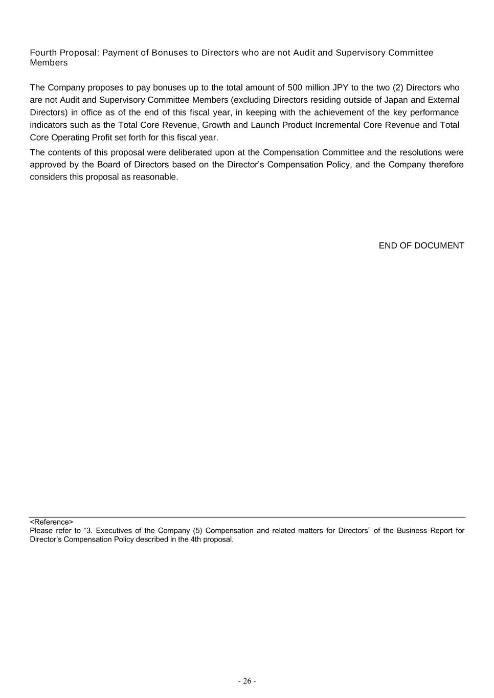 - 26 - Fourth Proposal: Payment of Bonuses to Directors who are not Audit and Supervisory Committee Members The Company proposes to pay bonuses up to the total amount of 500 million JPY to the two (2) Directors who are not Audit and Supervisory Committee Members (excluding Directors residing outside of Japan and External Directors) in office as of the end of this fiscal year, in keeping with the achievement of the key performance indicators such as the Total Core Revenue, Growth and Launch Product Incremental Core Revenue and Total Core Operating Profit set forth for this fiscal year. The contents of this proposal were deliberated upon at the Compensation Committee and the resolutions were approved by the Board of Directors based on the Director’s Compensation Policy, and the Company therefore considers this proposal as reasonable. END OF DOCUMENT <Reference> Please refer to “3. Executives of the Company (5) Compensation and related matters for Directors” of the Business Report for Director’s Compensation Policy described in the 4th proposal.