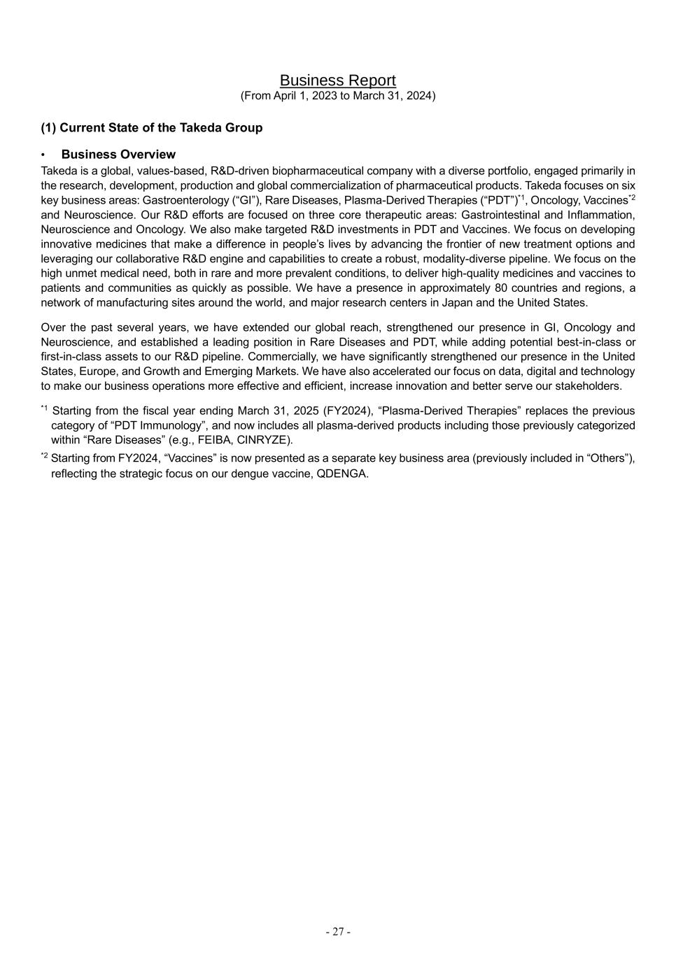 - 27 - Business Report (From April 1, 2023 to March 31, 2024) (1) Current State of the Takeda Group • Business Overview Takeda is a global, values-based, R&D-driven biopharmaceutical company with a diverse portfolio, engaged primarily in the research, development, production and global commercialization of pharmaceutical products. Takeda focuses on six key business areas: Gastroenterology (“GI”), Rare Diseases, Plasma-Derived Therapies (“PDT”)*1, Oncology, Vaccines*2 and Neuroscience. Our R&D efforts are focused on three core therapeutic areas: Gastrointestinal and Inflammation, Neuroscience and Oncology. We also make targeted R&D investments in PDT and Vaccines. We focus on developing innovative medicines that make a difference in people’s lives by advancing the frontier of new treatment options and leveraging our collaborative R&D engine and capabilities to create a robust, modality-diverse pipeline. We focus on the high unmet medical need, both in rare and more prevalent conditions, to deliver high-quality medicines and vaccines to patients and communities as quickly as possible. We have a presence in approximately 80 countries and regions, a network of manufacturing sites around the world, and major research centers in Japan and the United States. Over the past several years, we have extended our global reach, strengthened our presence in GI, Oncology and Neuroscience, and established a leading position in Rare Diseases and PDT, while adding potential best-in-class or first-in-class assets to our R&D pipeline. Commercially, we have significantly strengthened our presence in the United States, Europe, and Growth and Emerging Markets. We have also accelerated our focus on data, digital and technology to make our business operations more effective and efficient, increase innovation and better serve our stakeholders. *1 Starting from the fiscal year ending March 31, 2025 (FY2024), “Plasma-Derived Therapies” replaces the previous category of “PDT Immunology”, and now includes all plasma-derived products including those previously categorized within “Rare Diseases” (e.g., FEIBA, CINRYZE). *2 Starting from FY2024, “Vaccines” is now presented as a separate key business area (previously included in “Others”), reflecting the strategic focus on our dengue vaccine, QDENGA.