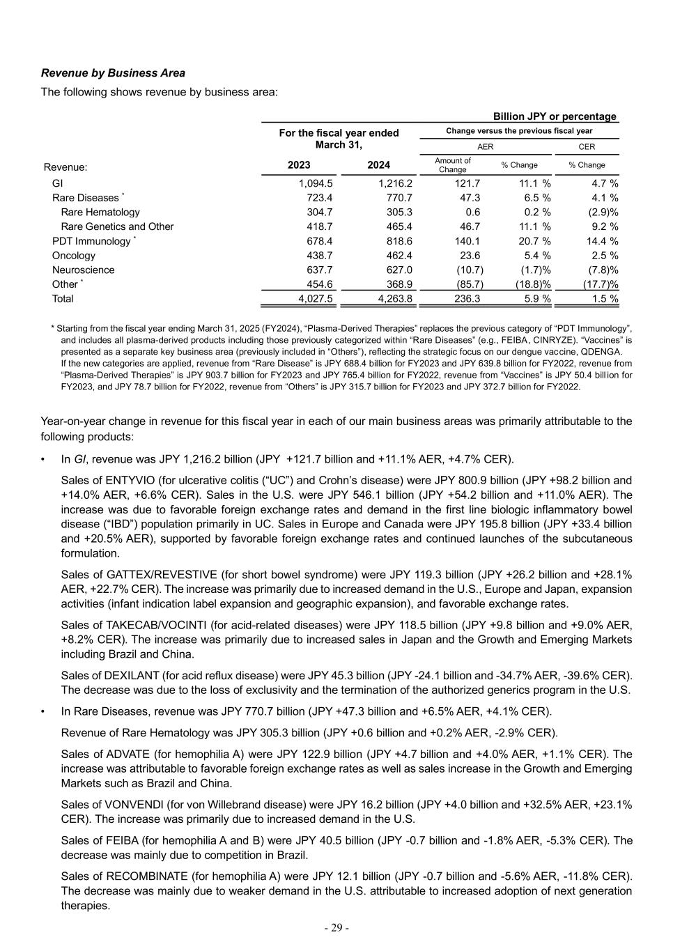 - 29 - Revenue by Business Area The following shows revenue by business area: Billion JPY or percentage For the fiscal year ended March 31, Change versus the previous fiscal year AER CER Revenue: 2023 2024 Amount of Change % Change % Change GI 1,094.5 1,216.2 121.7 11.1 % 4.7 % Rare Diseases * 723.4 770.7 47.3 6.5 % 4.1 % Rare Hematology 304.7 305.3 0.6 0.2 % (2.9) % Rare Genetics and Other 418.7 465.4 46.7 11.1 % 9.2 % PDT Immunology * 678.4 818.6 140.1 20.7 % 14.4 % Oncology 438.7 462.4 23.6 5.4 % 2.5 % Neuroscience 637.7 627.0 (10.7) (1.7) % (7.8) % Other * 454.6 368.9 (85.7) (18.8)% (17.7)% Total 4,027.5 4,263.8 236.3 5.9 % 1.5 % * Starting from the fiscal year ending March 31, 2025 (FY2024), “Plasma-Derived Therapies” replaces the previous category of “PDT Immunology”, and includes all plasma-derived products including those previously categorized within “Rare Diseases” (e.g., FEIBA, CINRYZE). “Vaccines” is presented as a separate key business area (previously included in “Others”), reflecting the strategic focus on our dengue vaccine, QDENGA. If the new categories are applied, revenue from “Rare Disease” is JPY 688.4 billion for FY2023 and JPY 639.8 billion for FY2022, revenue from “Plasma-Derived Therapies” is JPY 903.7 billion for FY2023 and JPY 765.4 billion for FY2022, revenue from “Vaccines” is JPY 50.4 bill ion for FY2023, and JPY 78.7 billion for FY2022, revenue from “Others” is JPY 315.7 billion for FY2023 and JPY 372.7 billion for FY2022. Year-on-year change in revenue for this fiscal year in each of our main business areas was primarily attributable to the following products: • In GI, revenue was JPY 1,216.2 billion (JPY +121.7 billion and +11.1% AER, +4.7% CER). Sales of ENTYVIO (for ulcerative colitis (“UC”) and Crohn’s disease) were JPY 800.9 billion (JPY +98.2 billion and +14.0% AER, +6.6% CER). Sales in the U.S. were JPY 546.1 billion (JPY +54.2 billion and +11.0% AER). The increase was due to favorable foreign exchange rates and demand in the first line biologic inflammatory bowel disease (“IBD”) population primarily in UC. Sales in Europe and Canada were JPY 195.8 billion (JPY +33.4 billion and +20.5% AER), supported by favorable foreign exchange rates and continued launches of the subcutaneous formulation. Sales of GATTEX/REVESTIVE (for short bowel syndrome) were JPY 119.3 billion (JPY +26.2 billion and +28.1% AER, +22.7% CER). The increase was primarily due to increased demand in the U.S., Europe and Japan, expansion activities (infant indication label expansion and geographic expansion), and favorable exchange rates. Sales of TAKECAB/VOCINTI (for acid-related diseases) were JPY 118.5 billion (JPY +9.8 billion and +9.0% AER, +8.2% CER). The increase was primarily due to increased sales in Japan and the Growth and Emerging Markets including Brazil and China. Sales of DEXILANT (for acid reflux disease) were JPY 45.3 billion (JPY -24.1 billion and -34.7% AER, -39.6% CER). The decrease was due to the loss of exclusivity and the termination of the authorized generics program in the U.S. • In Rare Diseases, revenue was JPY 770.7 billion (JPY +47.3 billion and +6.5% AER, +4.1% CER). Revenue of Rare Hematology was JPY 305.3 billion (JPY +0.6 billion and +0.2% AER, -2.9% CER). Sales of ADVATE (for hemophilia A) were JPY 122.9 billion (JPY +4.7 billion and +4.0% AER, +1.1% CER). The increase was attributable to favorable foreign exchange rates as well as sales increase in the Growth and Emerging Markets such as Brazil and China. Sales of VONVENDI (for von Willebrand disease) were JPY 16.2 billion (JPY +4.0 billion and +32.5% AER, +23.1% CER). The increase was primarily due to increased demand in the U.S. Sales of FEIBA (for hemophilia A and B) were JPY 40.5 billion (JPY -0.7 billion and -1.8% AER, -5.3% CER). The decrease was mainly due to competition in Brazil. Sales of RECOMBINATE (for hemophilia A) were JPY 12.1 billion (JPY -0.7 billion and -5.6% AER, -11.8% CER). The decrease was mainly due to weaker demand in the U.S. attributable to increased adoption of next generation therapies.