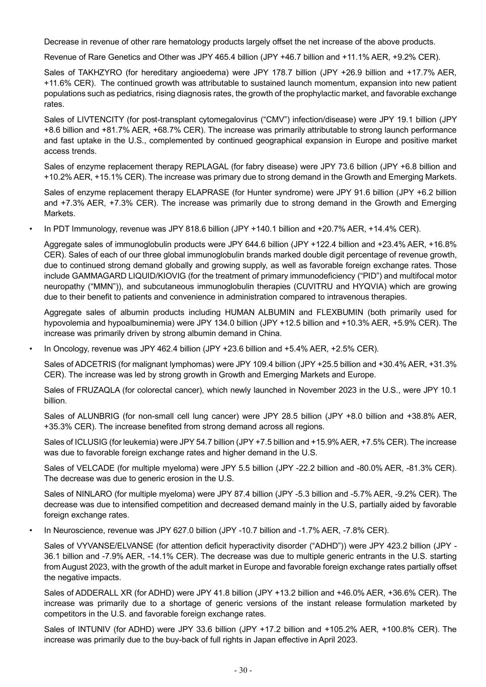 - 30 - Decrease in revenue of other rare hematology products largely offset the net increase of the above products. Revenue of Rare Genetics and Other was JPY 465.4 billion (JPY +46.7 billion and +11.1% AER, +9.2% CER). Sales of TAKHZYRO (for hereditary angioedema) were JPY 178.7 billion (JPY +26.9 billion and +17.7% AER, +11.6% CER). The continued growth was attributable to sustained launch momentum, expansion into new patient populations such as pediatrics, rising diagnosis rates, the growth of the prophylactic market, and favorable exchange rates. Sales of LIVTENCITY (for post-transplant cytomegalovirus (“CMV”) infection/disease) were JPY 19.1 billion (JPY +8.6 billion and +81.7% AER, +68.7% CER). The increase was primarily attributable to strong launch performance and fast uptake in the U.S., complemented by continued geographical expansion in Europe and positive market access trends. Sales of enzyme replacement therapy REPLAGAL (for fabry disease) were JPY 73.6 billion (JPY +6.8 billion and +10.2% AER, +15.1% CER). The increase was primary due to strong demand in the Growth and Emerging Markets. Sales of enzyme replacement therapy ELAPRASE (for Hunter syndrome) were JPY 91.6 billion (JPY +6.2 billion and +7.3% AER, +7.3% CER). The increase was primarily due to strong demand in the Growth and Emerging Markets. • In PDT Immunology, revenue was JPY 818.6 billion (JPY +140.1 billion and +20.7% AER, +14.4% CER). Aggregate sales of immunoglobulin products were JPY 644.6 billion (JPY +122.4 billion and +23.4% AER, +16.8% CER). Sales of each of our three global immunoglobulin brands marked double digit percentage of revenue growth, due to continued strong demand globally and growing supply, as well as favorable foreign exchange rates. Those include GAMMAGARD LIQUID/KIOVIG (for the treatment of primary immunodeficiency (“PID”) and multifocal motor neuropathy (“MMN”)), and subcutaneous immunoglobulin therapies (CUVITRU and HYQVIA) which are growing due to their benefit to patients and convenience in administration compared to intravenous therapies. Aggregate sales of albumin products including HUMAN ALBUMIN and FLEXBUMIN (both primarily used for hypovolemia and hypoalbuminemia) were JPY 134.0 billion (JPY +12.5 billion and +10.3% AER, +5.9% CER). The increase was primarily driven by strong albumin demand in China. • In Oncology, revenue was JPY 462.4 billion (JPY +23.6 billion and +5.4% AER, +2.5% CER). Sales of ADCETRIS (for malignant lymphomas) were JPY 109.4 billion (JPY +25.5 billion and +30.4% AER, +31.3% CER). The increase was led by strong growth in Growth and Emerging Markets and Europe. Sales of FRUZAQLA (for colorectal cancer), which newly launched in November 2023 in the U.S., were JPY 10.1 billion. Sales of ALUNBRIG (for non-small cell lung cancer) were JPY 28.5 billion (JPY +8.0 billion and +38.8% AER, +35.3% CER). The increase benefited from strong demand across all regions. Sales of ICLUSIG (for leukemia) were JPY 54.7 billion (JPY +7.5 billion and +15.9% AER, +7.5% CER). The increase was due to favorable foreign exchange rates and higher demand in the U.S. Sales of VELCADE (for multiple myeloma) were JPY 5.5 billion (JPY -22.2 billion and -80.0% AER, -81.3% CER). The decrease was due to generic erosion in the U.S. Sales of NINLARO (for multiple myeloma) were JPY 87.4 billion (JPY -5.3 billion and -5.7% AER, -9.2% CER). The decrease was due to intensified competition and decreased demand mainly in the U.S, partially aided by favorable foreign exchange rates. • In Neuroscience, revenue was JPY 627.0 billion (JPY -10.7 billion and -1.7% AER, -7.8% CER). Sales of VYVANSE/ELVANSE (for attention deficit hyperactivity disorder (“ADHD”)) were JPY 423.2 billion (JPY - 36.1 billion and -7.9% AER, -14.1% CER). The decrease was due to multiple generic entrants in the U.S. starting from August 2023, with the growth of the adult market in Europe and favorable foreign exchange rates partially offset the negative impacts. Sales of ADDERALL XR (for ADHD) were JPY 41.8 billion (JPY +13.2 billion and +46.0% AER, +36.6% CER). The increase was primarily due to a shortage of generic versions of the instant release formulation marketed by competitors in the U.S. and favorable foreign exchange rates. Sales of INTUNIV (for ADHD) were JPY 33.6 billion (JPY +17.2 billion and +105.2% AER, +100.8% CER). The increase was primarily due to the buy-back of full rights in Japan effective in April 2023.