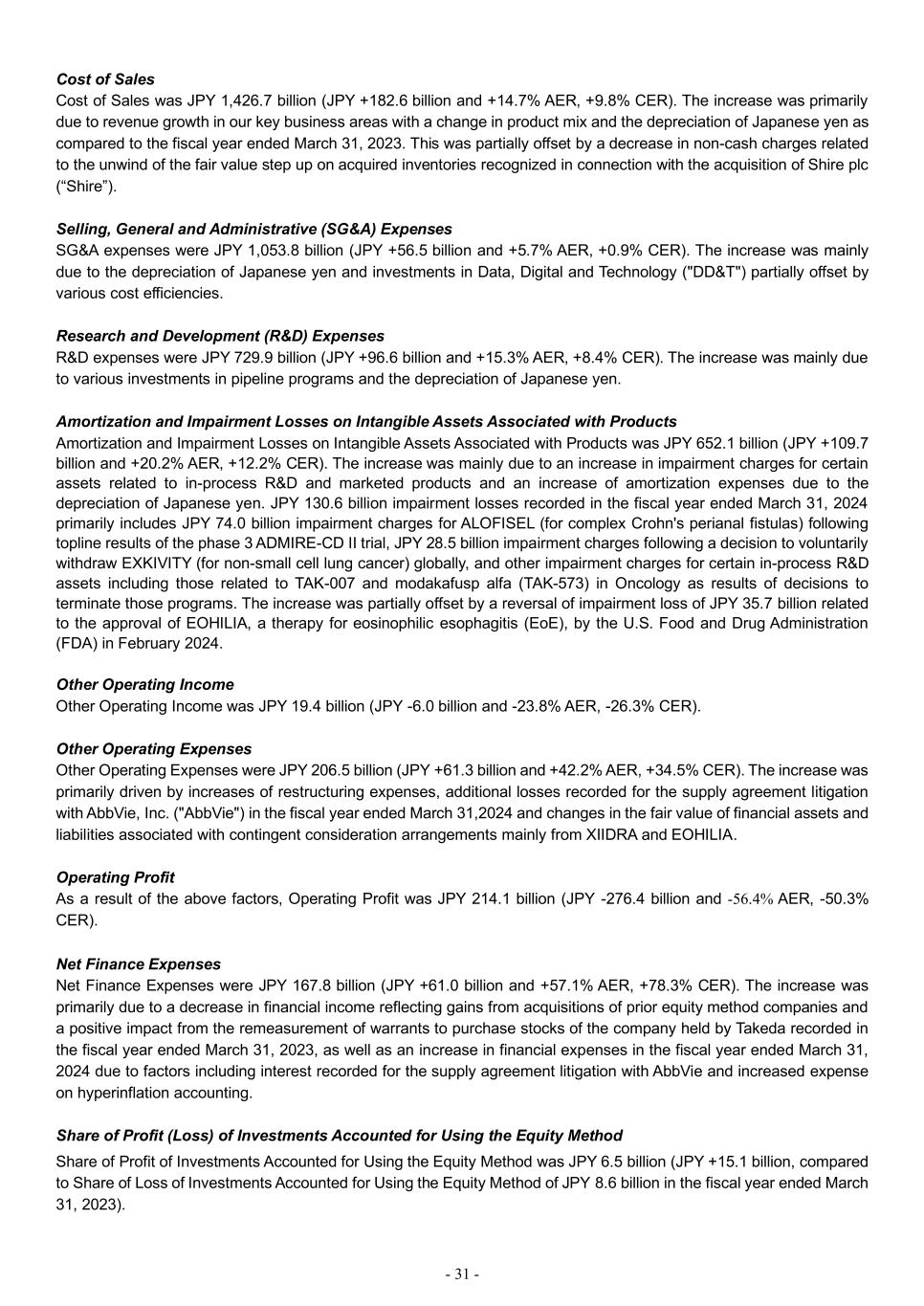 - 31 - Cost of Sales Cost of Sales was JPY 1,426.7 billion (JPY +182.6 billion and +14.7% AER, +9.8% CER). The increase was primarily due to revenue growth in our key business areas with a change in product mix and the depreciation of Japanese yen as compared to the fiscal year ended March 31, 2023. This was partially offset by a decrease in non-cash charges related to the unwind of the fair value step up on acquired inventories recognized in connection with the acquisition of Shire plc (“Shire”). Selling, General and Administrative (SG&A) Expenses SG&A expenses were JPY 1,053.8 billion (JPY +56.5 billion and +5.7% AER, +0.9% CER). The increase was mainly due to the depreciation of Japanese yen and investments in Data, Digital and Technology ("DD&T") partially offset by various cost efficiencies. Research and Development (R&D) Expenses R&D expenses were JPY 729.9 billion (JPY +96.6 billion and +15.3% AER, +8.4% CER). The increase was mainly due to various investments in pipeline programs and the depreciation of Japanese yen. Amortization and Impairment Losses on Intangible Assets Associated with Products Amortization and Impairment Losses on Intangible Assets Associated with Products was JPY 652.1 billion (JPY +109.7 billion and +20.2% AER, +12.2% CER). The increase was mainly due to an increase in impairment charges for certain assets related to in-process R&D and marketed products and an increase of amortization expenses due to the depreciation of Japanese yen. JPY 130.6 billion impairment losses recorded in the fiscal year ended March 31, 2024 primarily includes JPY 74.0 billion impairment charges for ALOFISEL (for complex Crohn's perianal fistulas) following topline results of the phase 3 ADMIRE-CD II trial, JPY 28.5 billion impairment charges following a decision to voluntarily withdraw EXKIVITY (for non-small cell lung cancer) globally, and other impairment charges for certain in-process R&D assets including those related to TAK-007 and modakafusp alfa (TAK-573) in Oncology as results of decisions to terminate those programs. The increase was partially offset by a reversal of impairment loss of JPY 35.7 billion related to the approval of EOHILIA, a therapy for eosinophilic esophagitis (EoE), by the U.S. Food and Drug Administration (FDA) in February 2024. Other Operating Income Other Operating Income was JPY 19.4 billion (JPY -6.0 billion and -23.8% AER, -26.3% CER). Other Operating Expenses Other Operating Expenses were JPY 206.5 billion (JPY +61.3 billion and +42.2% AER, +34.5% CER). The increase was primarily driven by increases of restructuring expenses, additional losses recorded for the supply agreement litigation with AbbVie, Inc. ("AbbVie") in the fiscal year ended March 31,2024 and changes in the fair value of financial assets and liabilities associated with contingent consideration arrangements mainly from XIIDRA and EOHILIA. Operating Profit As a result of the above factors, Operating Profit was JPY 214.1 billion (JPY -276.4 billion and -56.4% AER, -50.3% CER). Net Finance Expenses Net Finance Expenses were JPY 167.8 billion (JPY +61.0 billion and +57.1% AER, +78.3% CER). The increase was primarily due to a decrease in financial income reflecting gains from acquisitions of prior equity method companies and a positive impact from the remeasurement of warrants to purchase stocks of the company held by Takeda recorded in the fiscal year ended March 31, 2023, as well as an increase in financial expenses in the fiscal year ended March 31, 2024 due to factors including interest recorded for the supply agreement litigation with AbbVie and increased expense on hyperinflation accounting. Share of Profit (Loss) of Investments Accounted for Using the Equity Method Share of Profit of Investments Accounted for Using the Equity Method was JPY 6.5 billion (JPY +15.1 billion, compared to Share of Loss of Investments Accounted for Using the Equity Method of JPY 8.6 billion in the fiscal year ended March 31, 2023).