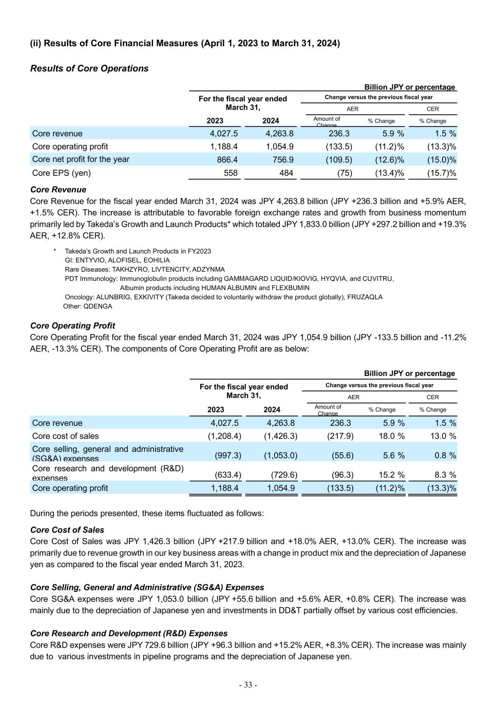 - 33 - (ii) Results of Core Financial Measures (April 1, 2023 to March 31, 2024) Results of Core Operations Billion JPY or percentage For the fiscal year ended March 31, Change versus the previous fiscal year AER CER 2023 2024 Amount of Change % Change % Change Core revenue 4,027.5 4,263.8 236.3 5.9 % 1.5 % Core operating profit 1,188.4 1,054.9 (133.5) (11.2) % (13.3)% Core net profit for the year 866.4 756.9 (109.5) (12.6)% (15.0)% Core EPS (yen) 558 484 (75) (13.4)% (15.7)% Core Revenue Core Revenue for the fiscal year ended March 31, 2024 was JPY 4,263.8 billion (JPY +236.3 billion and +5.9% AER, +1.5% CER). The increase is attributable to favorable foreign exchange rates and growth from business momentum primarily led by Takeda’s Growth and Launch Products* which totaled JPY 1,833.0 billion (JPY +297.2 billion and +19.3% AER, +12.8% CER). * Takeda’s Growth and Launch Products in FY2023 GI: ENTYVIO, ALOFISEL, EOHILIA Rare Diseases: TAKHZYRO, LIVTENCITY, ADZYNMA PDT Immunology: Immunoglobulin products including GAMMAGARD LIQUID/KIOVIG, HYQVIA, and CUVITRU, Albumin products including HUMAN ALBUMIN and FLEXBUMIN Oncology: ALUNBRIG, EXKIVITY (Takeda decided to voluntarily withdraw the product globally), FRUZAQLA Other: QDENGA Core Operating Profit Core Operating Profit for the fiscal year ended March 31, 2024 was JPY 1,054.9 billion (JPY -133.5 billion and -11.2% AER, -13.3% CER). The components of Core Operating Profit are as below: Billion JPY or percentage For the fiscal year ended March 31, Change versus the previous fiscal year AER CER 2023 2024 Amount of Change % Change % Change Core revenue 4,027.5 4,263.8 236.3 5.9 % 1.5 % Core cost of sales (1,208.4) (1,426.3) (217.9) 18.0 % 13.0 % Core selling, general and administrative (SG&A) expenses (997.3) (1,053.0) (55.6) 5.6 % 0.8 % Core research and development (R&D) expenses (633.4) (729.6) (96.3) 15.2 % 8.3 % Core operating profit 1,188.4 1,054.9 (133.5) (11.2) % (13.3)% During the periods presented, these items fluctuated as follows: Core Cost of Sales Core Cost of Sales was JPY 1,426.3 billion (JPY +217.9 billion and +18.0% AER, +13.0% CER). The increase was primarily due to revenue growth in our key business areas with a change in product mix and the depreciation of Japanese yen as compared to the fiscal year ended March 31, 2023. Core Selling, General and Administrative (SG&A) Expenses Core SG&A expenses were JPY 1,053.0 billion (JPY +55.6 billion and +5.6% AER, +0.8% CER). The increase was mainly due to the depreciation of Japanese yen and investments in DD&T partially offset by various cost efficiencies. Core Research and Development (R&D) Expenses Core R&D expenses were JPY 729.6 billion (JPY +96.3 billion and +15.2% AER, +8.3% CER). The increase was mainly due to various investments in pipeline programs and the depreciation of Japanese yen.