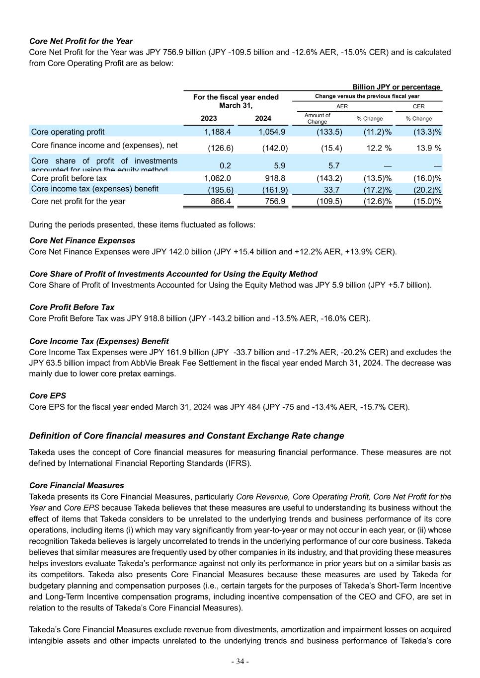 - 34 - Core Net Profit for the Year Core Net Profit for the Year was JPY 756.9 billion (JPY -109.5 billion and -12.6% AER, -15.0% CER) and is calculated from Core Operating Profit are as below: Billion JPY or percentage For the fiscal year ended March 31, Change versus the previous fiscal year AER CER 2023 2024 Amount of Change % Change % Change Core operating profit 1,188.4 1,054.9 (133.5) (11.2) % (13.3)% Core finance income and (expenses), net (126.6) (142.0) (15.4) 12.2 % 13.9 % Core share of profit of investments accounted for using the equity method 0.2 5.9 5.7 ― ― Core profit before tax 1,062.0 918.8 (143.2) (13.5)% (16.0)% Core income tax (expenses) benefit (195.6) (161.9) 33.7 (17.2)% (20.2)% Core net profit for the year 866.4 756.9 (109.5) (12.6)% (15.0)% During the periods presented, these items fluctuated as follows: Core Net Finance Expenses Core Net Finance Expenses were JPY 142.0 billion (JPY +15.4 billion and +12.2% AER, +13.9% CER). Core Share of Profit of Investments Accounted for Using the Equity Method Core Share of Profit of Investments Accounted for Using the Equity Method was JPY 5.9 billion (JPY +5.7 billion). Core Profit Before Tax Core Profit Before Tax was JPY 918.8 billion (JPY -143.2 billion and -13.5% AER, -16.0% CER). Core Income Tax (Expenses) Benefit Core Income Tax Expenses were JPY 161.9 billion (JPY -33.7 billion and -17.2% AER, -20.2% CER) and excludes the JPY 63.5 billion impact from AbbVie Break Fee Settlement in the fiscal year ended March 31, 2024. The decrease was mainly due to lower core pretax earnings. Core EPS Core EPS for the fiscal year ended March 31, 2024 was JPY 484 (JPY -75 and -13.4% AER, -15.7% CER). Definition of Core financial measures and Constant Exchange Rate change Takeda uses the concept of Core financial measures for measuring financial performance. These measures are not defined by International Financial Reporting Standards (IFRS). Core Financial Measures Takeda presents its Core Financial Measures, particularly Core Revenue, Core Operating Profit, Core Net Profit for the Year and Core EPS because Takeda believes that these measures are useful to understanding its business without the effect of items that Takeda considers to be unrelated to the underlying trends and business performance of its core operations, including items (i) which may vary significantly from year-to-year or may not occur in each year, or (ii) whose recognition Takeda believes is largely uncorrelated to trends in the underlying performance of our core business. Takeda believes that similar measures are frequently used by other companies in its industry, and that providing these measures helps investors evaluate Takeda’s performance against not only its performance in prior years but on a similar basis as its competitors. Takeda also presents Core Financial Measures because these measures are used by Takeda for budgetary planning and compensation purposes (i.e., certain targets for the purposes of Takeda’s Short-Term Incentive and Long-Term Incentive compensation programs, including incentive compensation of the CEO and CFO, are set in relation to the results of Takeda’s Core Financial Measures). Takeda’s Core Financial Measures exclude revenue from divestments, amortization and impairment losses on acquired intangible assets and other impacts unrelated to the underlying trends and business performance of Takeda’s core