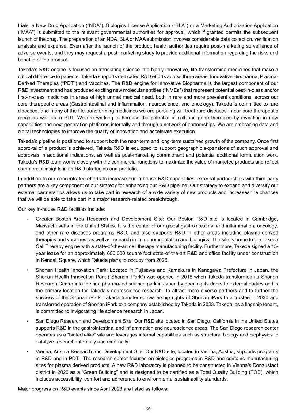 - 36 - trials, a New Drug Application ("NDA"), Biologics License Application (“BLA”) or a Marketing Authorization Application (“MAA”) is submitted to the relevant governmental authorities for approval, which if granted permits the subsequent launch of the drug. The preparation of an NDA, BLA or MAA submission involves considerable data collection, verification, analysis and expense. Even after the launch of the product, health authorities require post-marketing surveillance of adverse events, and they may request a post-marketing study to provide additional information regarding the risks and benefits of the product. Takeda’s R&D engine is focused on translating science into highly innovative, life-transforming medicines that make a critical difference to patients. Takeda supports dedicated R&D efforts across three areas: Innovative Biopharma, Plasma- Derived Therapies (“PDT”) and Vaccines. The R&D engine for Innovative Biopharma is the largest component of our R&D investment and has produced exciting new molecular entities (“NMEs”) that represent potential best-in-class and/or first-in-class medicines in areas of high unmet medical need, both in rare and more prevalent conditions, across our core therapeutic areas (Gastrointestinal and inflammation, neuroscience, and oncology). Takeda is committed to rare diseases, and many of the life-transforming medicines we are pursuing will treat rare diseases in our core therapeutic areas as well as in PDT. We are working to harness the potential of cell and gene therapies by investing in new capabilities and next-generation platforms internally and through a network of partnerships. We are embracing data and digital technologies to improve the quality of innovation and accelerate execution. Takeda’s pipeline is positioned to support both the near-term and long-term sustained growth of the company. Once first approval of a product is achieved, Takeda R&D is equipped to support geographic expansions of such approval and approvals in additional indications, as well as post-marketing commitment and potential additional formulation work. Takeda’s R&D team works closely with the commercial functions to maximize the value of marketed products and reflect commercial insights in its R&D strategies and portfolio. In addition to our concentrated efforts to increase our in-house R&D capabilities, external partnerships with third-party partners are a key component of our strategy for enhancing our R&D pipeline. Our strategy to expand and diversify our external partnerships allows us to take part in research of a wide variety of new products and increases the chances that we will be able to take part in a major research-related breakthrough. Our key in-house R&D facilities include: • Greater Boston Area Research and Development Site: Our Boston R&D site is located in Cambridge, Massachusetts in the United States. It is the center of our global gastrointestinal and inflammation, oncology, and other rare diseases programs R&D, and also supports R&D in other areas including plasma-derived therapies and vaccines, as well as research in immunomodulation and biologics. The site is home to the Takeda Cell Therapy engine with a state-of-the-art cell therapy manufacturing facility. Furthermore, Takeda signed a 15- year lease for an approximately 600,000 square foot state-of-the-art R&D and office facility under construction in Kendall Square, which Takeda plans to occupy from 2026. • Shonan Health Innovation Park: Located in Fujisawa and Kamakura in Kanagawa Prefecture in Japan, the Shonan Health Innovation Park (“Shonan iPark”) was opened in 2018 when Takeda transformed its Shonan Research Center into the first pharma-led science park in Japan by opening its doors to external parties and is the primary location for Takeda’s neuroscience research. To attract more diverse partners and to further the success of the Shonan iPark, Takeda transferred ownership rights of Shonan iPark to a trustee in 2020 and transferred operation of Shonan iPark to a company established by Takeda in 2023. Takeda, as a flagship tenant, is committed to invigorating life science research in Japan. • San Diego Research and Development Site: Our R&D site located in San Diego, California in the United States supports R&D in the gastrointestinal and inflammation and neuroscience areas. The San Diego research center operates as a “biotech-like” site and leverages internal capabilities such as structural biology and biophysics to catalyze research internally and externally. • Vienna, Austria Research and Development Site: Our R&D site, located in Vienna, Austria, supports programs in R&D and in PDT. The research center focuses on biologics programs in R&D and contains manufacturing sites for plasma derived products. A new R&D laboratory is planned to be constructed in Vienna's Donaustadt district in 2026 as a “Green Building” and is designed to be certified as a Total Quality Building (TQB), which includes accessibility, comfort and adherence to environmental sustainability standards. Major progress on R&D events since April 2023 are listed as follows: