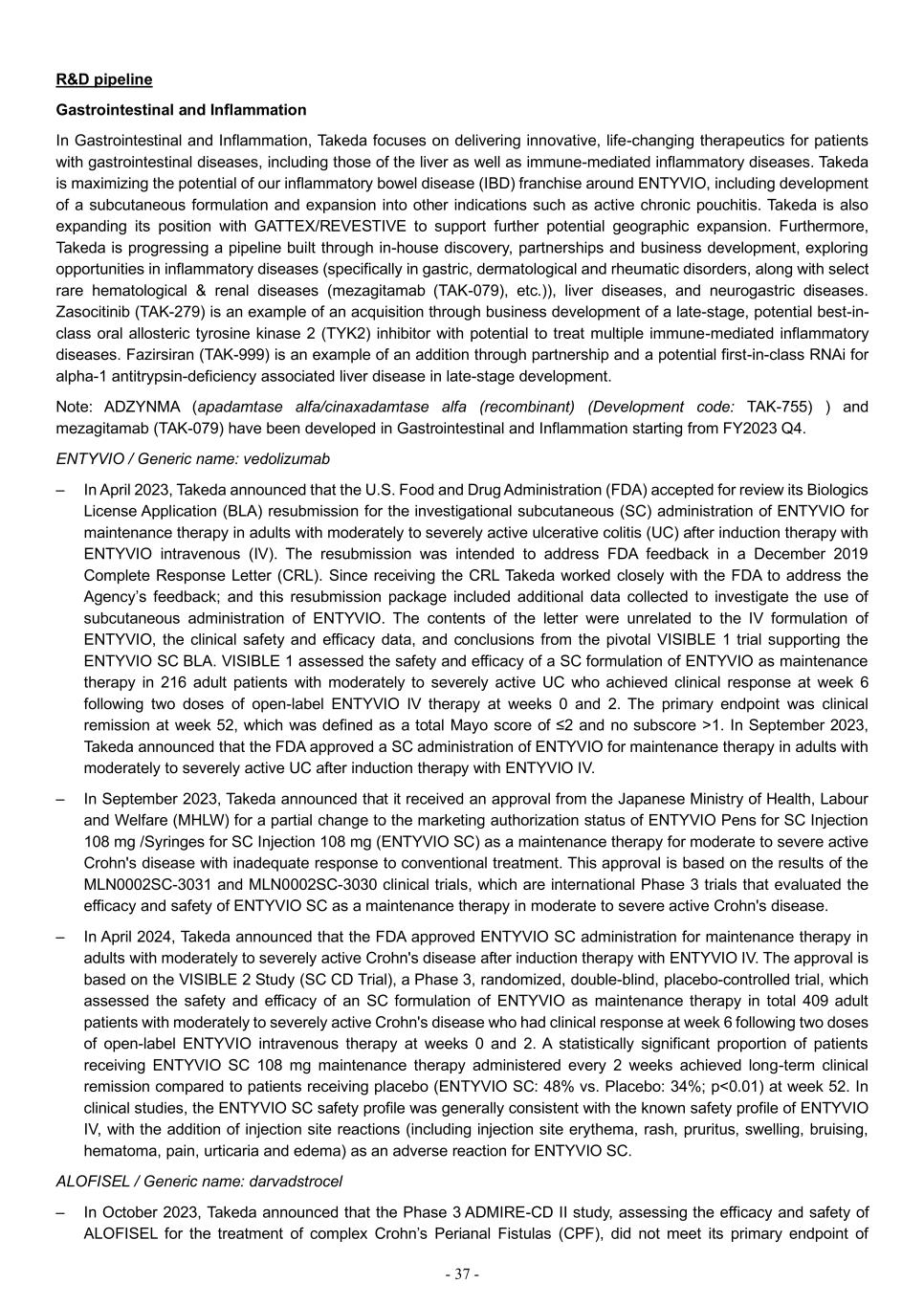 - 37 - R&D pipeline Gastrointestinal and Inflammation In Gastrointestinal and Inflammation, Takeda focuses on delivering innovative, life-changing therapeutics for patients with gastrointestinal diseases, including those of the liver as well as immune-mediated inflammatory diseases. Takeda is maximizing the potential of our inflammatory bowel disease (IBD) franchise around ENTYVIO, including development of a subcutaneous formulation and expansion into other indications such as active chronic pouchitis. Takeda is also expanding its position with GATTEX/REVESTIVE to support further potential geographic expansion. Furthermore, Takeda is progressing a pipeline built through in-house discovery, partnerships and business development, exploring opportunities in inflammatory diseases (specifically in gastric, dermatological and rheumatic disorders, along with select rare hematological & renal diseases (mezagitamab (TAK-079), etc.)), liver diseases, and neurogastric diseases. Zasocitinib (TAK-279) is an example of an acquisition through business development of a late-stage, potential best-in- class oral allosteric tyrosine kinase 2 (TYK2) inhibitor with potential to treat multiple immune-mediated inflammatory diseases. Fazirsiran (TAK-999) is an example of an addition through partnership and a potential first-in-class RNAi for alpha-1 antitrypsin-deficiency associated liver disease in late-stage development. Note: ADZYNMA (apadamtase alfa/cinaxadamtase alfa (recombinant) (Development code: TAK-755) ) and mezagitamab (TAK-079) have been developed in Gastrointestinal and Inflammation starting from FY2023 Q4. ENTYVIO / Generic name: vedolizumab – In April 2023, Takeda announced that the U.S. Food and Drug Administration (FDA) accepted for review its Biologics License Application (BLA) resubmission for the investigational subcutaneous (SC) administration of ENTYVIO for maintenance therapy in adults with moderately to severely active ulcerative colitis (UC) after induction therapy with ENTYVIO intravenous (IV). The resubmission was intended to address FDA feedback in a December 2019 Complete Response Letter (CRL). Since receiving the CRL Takeda worked closely with the FDA to address the Agency’s feedback; and this resubmission package included additional data collected to investigate the use of subcutaneous administration of ENTYVIO. The contents of the letter were unrelated to the IV formulation of ENTYVIO, the clinical safety and efficacy data, and conclusions from the pivotal VISIBLE 1 trial supporting the ENTYVIO SC BLA. VISIBLE 1 assessed the safety and efficacy of a SC formulation of ENTYVIO as maintenance therapy in 216 adult patients with moderately to severely active UC who achieved clinical response at week 6 following two doses of open-label ENTYVIO IV therapy at weeks 0 and 2. The primary endpoint was clinical remission at week 52, which was defined as a total Mayo score of ≤2 and no subscore >1. In September 2023, Takeda announced that the FDA approved a SC administration of ENTYVIO for maintenance therapy in adults with moderately to severely active UC after induction therapy with ENTYVIO IV. – In September 2023, Takeda announced that it received an approval from the Japanese Ministry of Health, Labour and Welfare (MHLW) for a partial change to the marketing authorization status of ENTYVIO Pens for SC Injection 108 mg /Syringes for SC Injection 108 mg (ENTYVIO SC) as a maintenance therapy for moderate to severe active Crohn's disease with inadequate response to conventional treatment. This approval is based on the results of the MLN0002SC-3031 and MLN0002SC-3030 clinical trials, which are international Phase 3 trials that evaluated the efficacy and safety of ENTYVIO SC as a maintenance therapy in moderate to severe active Crohn's disease. – In April 2024, Takeda announced that the FDA approved ENTYVIO SC administration for maintenance therapy in adults with moderately to severely active Crohn's disease after induction therapy with ENTYVIO IV. The approval is based on the VISIBLE 2 Study (SC CD Trial), a Phase 3, randomized, double-blind, placebo-controlled trial, which assessed the safety and efficacy of an SC formulation of ENTYVIO as maintenance therapy in total 409 adult patients with moderately to severely active Crohn's disease who had clinical response at week 6 following two doses of open-label ENTYVIO intravenous therapy at weeks 0 and 2. A statistically significant proportion of patients receiving ENTYVIO SC 108 mg maintenance therapy administered every 2 weeks achieved long-term clinical remission compared to patients receiving placebo (ENTYVIO SC: 48% vs. Placebo: 34%; p<0.01) at week 52. In clinical studies, the ENTYVIO SC safety profile was generally consistent with the known safety profile of ENTYVIO IV, with the addition of injection site reactions (including injection site erythema, rash, pruritus, swelling, bruising, hematoma, pain, urticaria and edema) as an adverse reaction for ENTYVIO SC. ALOFISEL / Generic name: darvadstrocel – In October 2023, Takeda announced that the Phase 3 ADMIRE-CD II study, assessing the efficacy and safety of ALOFISEL for the treatment of complex Crohn’s Perianal Fistulas (CPF), did not meet its primary endpoint of
