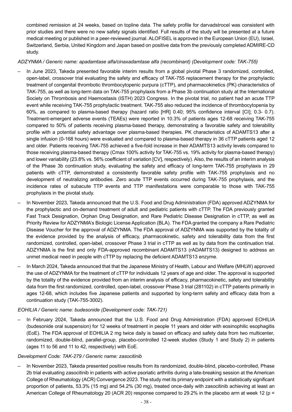 - 38 - combined remission at 24 weeks, based on topline data. The safety profile for darvadstrocel was consistent with prior studies and there were no new safety signals identified. Full results of the study will be presented at a future medical meeting or published in a peer-reviewed journal. ALOFISEL is approved in the European Union (EU), Israel, Switzerland, Serbia, United Kingdom and Japan based on positive data from the previously completed ADMIRE-CD study. ADZYNMA / Generic name: apadamtase alfa/cinaxadamtase alfa (recombinant) (Development code: TAK-755) – In June 2023, Takeda presented favorable interim results from a global pivotal Phase 3 randomized, controlled, open-label, crossover trial evaluating the safety and efficacy of TAK-755 replacement therapy for the prophylactic treatment of congenital thrombotic thrombocytopenic purpura (cTTP), and pharmacokinetics (PK) characteristics of TAK-755, as well as long-term data on TAK-755 prophylaxis from a Phase 3b continuation study at the International Society on Thrombosis and Haemostasis (ISTH) 2023 Congress. In the pivotal trial, no patient had an acute TTP event while receiving TAK-755 prophylactic treatment. TAK-755 also reduced the incidence of thrombocytopenia by 60%, as compared to plasma-based therapy (hazard ratio [HR] 0.40; 95% confidence interval [CI]; 0.3- 0.7). Treatment-emergent adverse events (TEAEs) were reported in 10.3% of patients ages 12-68 receiving TAK-755 compared to 50% of patients receiving plasma-based therapy, demonstrating a favorable safety and tolerability profile with a potential safety advantage over plasma-based therapies. PK characteristics of ADAMTS13 after a single infusion (0-168 hours) were evaluated and compared to plasma-based therapy in 36 cTTP patients aged 12 and older. Patients receiving TAK-755 achieved a five-fold increase in their ADAMTS13 activity levels compared to those receiving plasma-based therapy (Cmax 100% activity for TAK-755 vs. 19% activity for plasma-based therapy) and lower variability (23.8% vs. 56% coefficient of variation [CV], respectively). Also, the results of an interim analysis of the Phase 3b continuation study, evaluating the safety and efficacy of long-term TAK-755 prophylaxis in 29 patients with cTTP, demonstrated a consistently favorable safety profile with TAK-755 prophylaxis and no development of neutralizing antibodies. Zero acute TTP events occurred during TAK-755 prophylaxis, and the incidence rates of subacute TTP events and TTP manifestations were comparable to those with TAK-755 prophylaxis in the pivotal study. – In November 2023, Takeda announced that the U.S. Food and Drug Administration (FDA) approved ADZYNMA for the prophylactic and on-demand treatment of adult and pediatric patients with cTTP. The FDA previously granted Fast Track Designation, Orphan Drug Designation, and Rare Pediatric Disease Designation in cTTP, as well as Priority Review for ADZYNMA’s Biologic License Application (BLA). The FDA granted the company a Rare Pediatric Disease Voucher for the approval of ADZYNMA. The FDA approval of ADZYNMA was supported by the totality of the evidence provided by the analysis of efficacy, pharmacokinetic, safety and tolerability data from the first randomized, controlled, open-label, crossover Phase 3 trial in cTTP as well as by data from the continuation trial. ADZYNMA is the first and only FDA-approved recombinant ADAMTS13 (rADAMTS13) designed to address an unmet medical need in people with cTTP by replacing the deficient ADAMTS13 enzyme. – In March 2024, Takeda announced that that the Japanese Ministry of Health, Labour and Welfare (MHLW) approved the use of ADZYNMA for the treatment of cTTP for individuals 12 years of age and older. The approval is supported by the totality of the evidence provided from an interim analysis of efficacy, pharmacokinetic, safety and tolerability data from the first randomized, controlled, open-label, crossover Phase 3 trial (281102) in cTTP patients primarily in ages 12-68, which includes five Japanese patients and supported by long-term safety and efficacy data from a continuation study (TAK-755-3002). EOHILIA / Generic name: budesonide (Development code: TAK-721) – In February 2024, Takeda announced that the U.S. Food and Drug Administration (FDA) approved EOHILIA (budesonide oral suspension) for 12 weeks of treatment in people 11 years and older with eosinophilic esophagitis (EoE). The FDA approval of EOHILIA 2 mg twice daily is based on efficacy and safety data from two multicenter, randomized, double-blind, parallel-group, placebo-controlled 12-week studies (Study 1 and Study 2) in patients (ages 11 to 56 and 11 to 42, respectively) with EoE. Development Code: TAK-279 / Generic name: zasocitinib – In November 2023, Takeda presented positive results from its randomized, double-blind, placebo-controlled, Phase 2b trial evaluating zasocitinib in patients with active psoriatic arthritis during a late-breaking session at the American College of Rheumatology (ACR) Convergence 2023. The study met its primary endpoint with a statistically significant proportion of patients, 53.3% (15 mg) and 54.2% (30 mg), treated once-daily with zasocitinib achieving at least an American College of Rheumatology 20 (ACR 20) response compared to 29.2% in the placebo arm at week 12 (p =